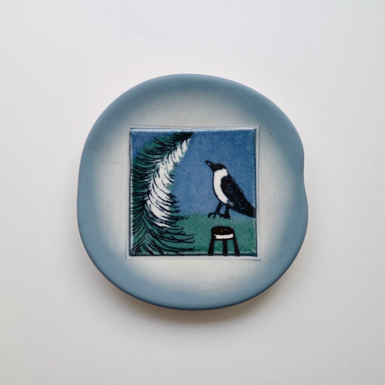 青のグラデーションが美しいウォールプレートに、こちらは1981年デザインの陶板 "Kuusi ja varis" =「トウヒとカラス」と同じ絵柄が中央にはめ込まれています。