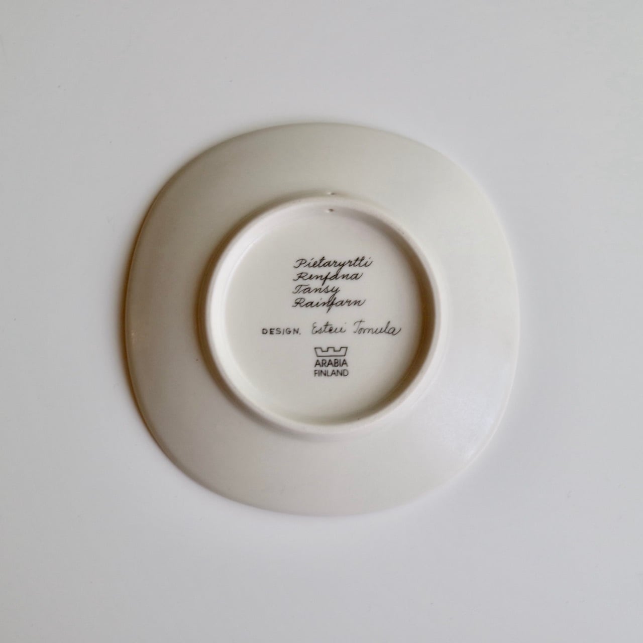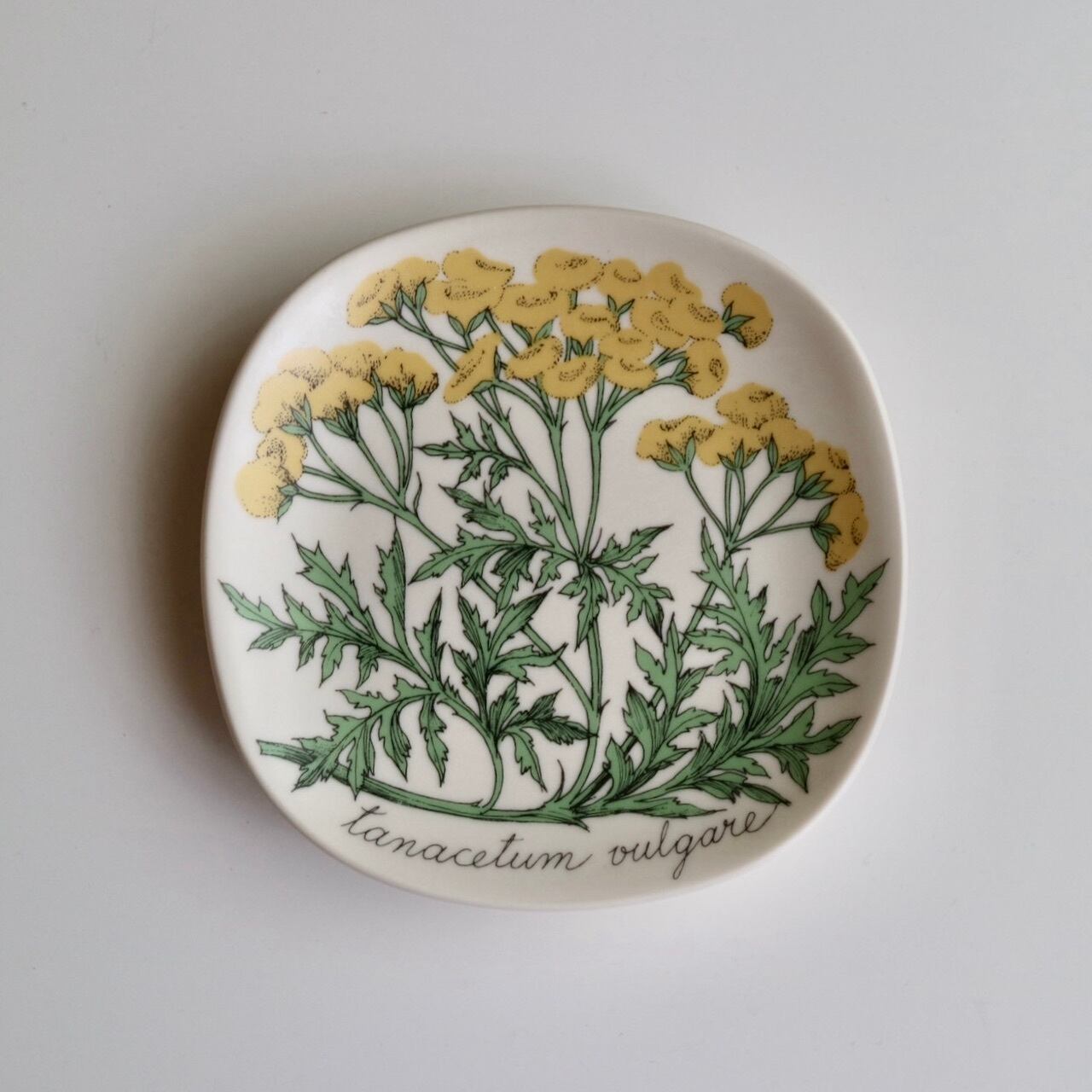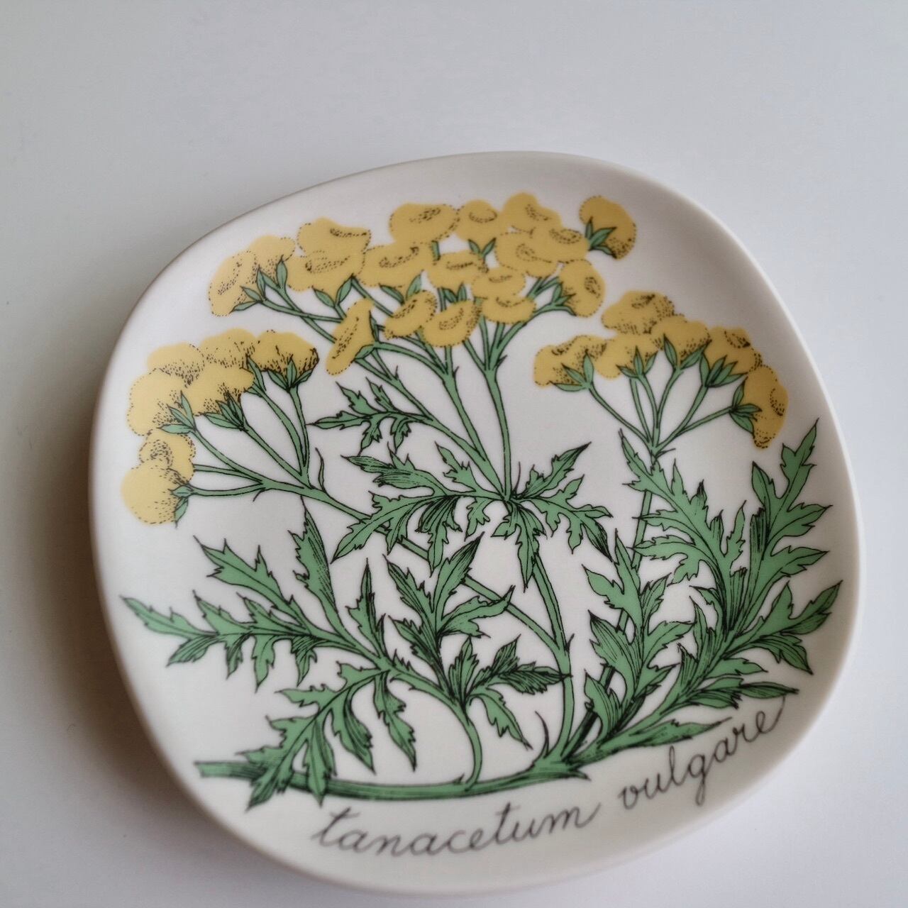 フィンランドの野生の花や果実などを描いたEsteri Tomula(エステリ・トムラ)デザインのBotanicaシリーズは1978年にスタートし1989年まで製作されました。こちらは1984年から1985年の間に製作されたタンジーで、密集したボタン状の小さく黄色い花が特徴的なお花です。毒がありますが、ギリシャ神話でも不死になる話があったりと、古くから魔除け・災難除けなどの意味を持つそうです。繊細な線はさることながら、黄色の花とぎざぎざの葉が描かれた構図までも美しく、とても素敵な一枚です。