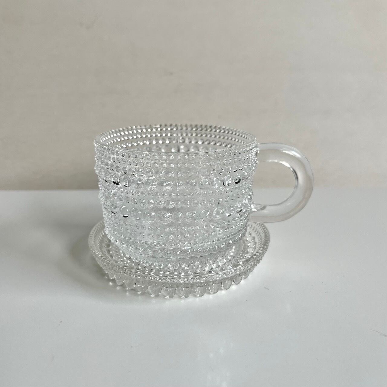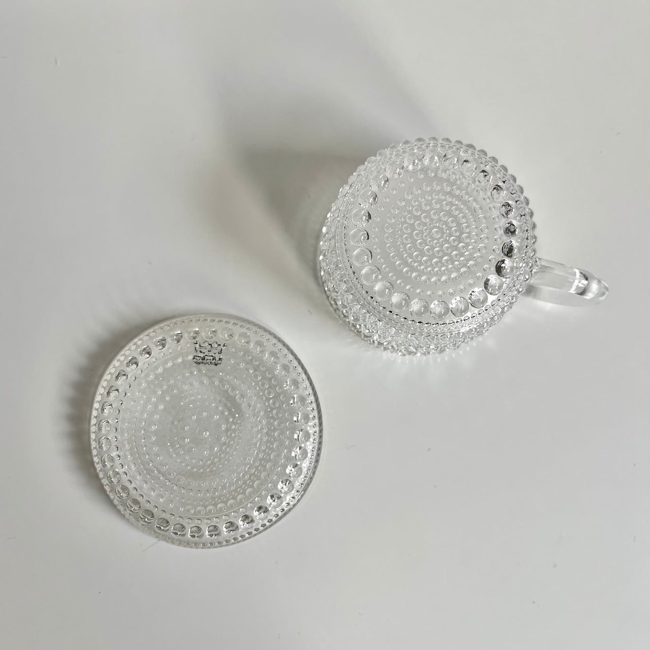 ガラスで露のしずくを表現したOiva Toikka(オイヴァ・トイッカ)デザインの名作シリーズ。Kastehelmiは現行でも復刻販売されていますが、古いものはつぶが立っていて、きらきらしている気がします。なお、こちらのカップ&ソーサーは復刻はされていないので、ヴィンテージだけの楽しみ。冷たい緑茶などを入れたりしても涼しげで素敵ですね。