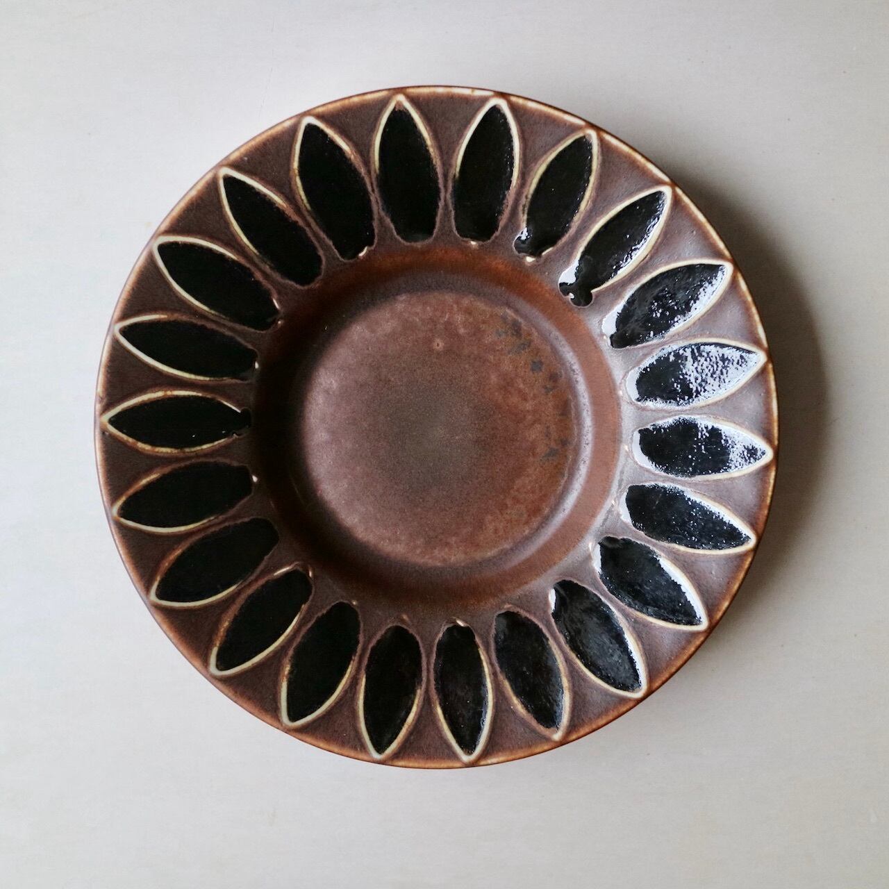 ロールストランドでKokaやBla EldなどをデザインしたHertha Bengtson(ヘルサ・ベングトソン)のボウルです。茶色の素地に厚いリムの部分に花弁のように描かれた黒の模様が印象的なデザインです。シックな向日葵という感じにも見えますね。