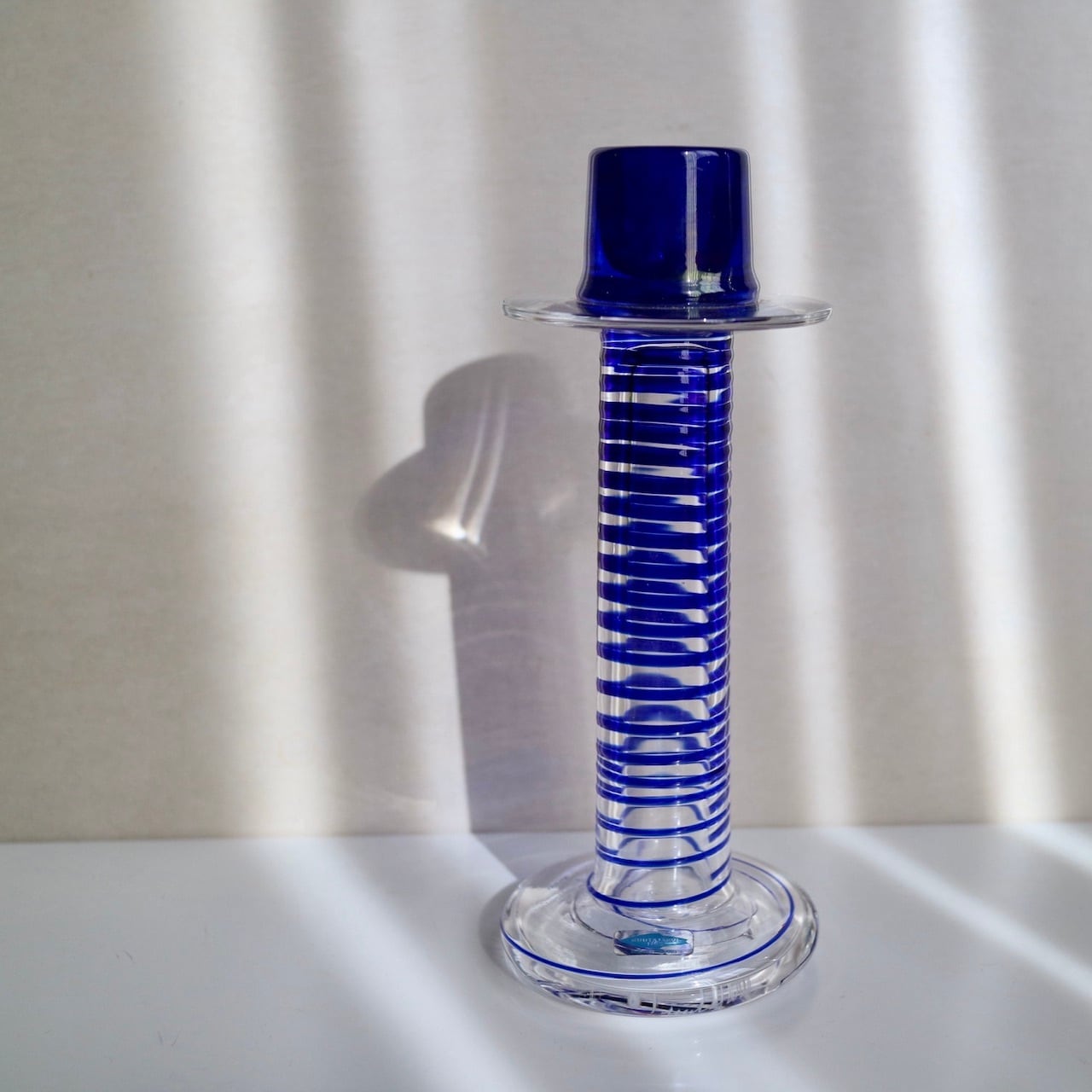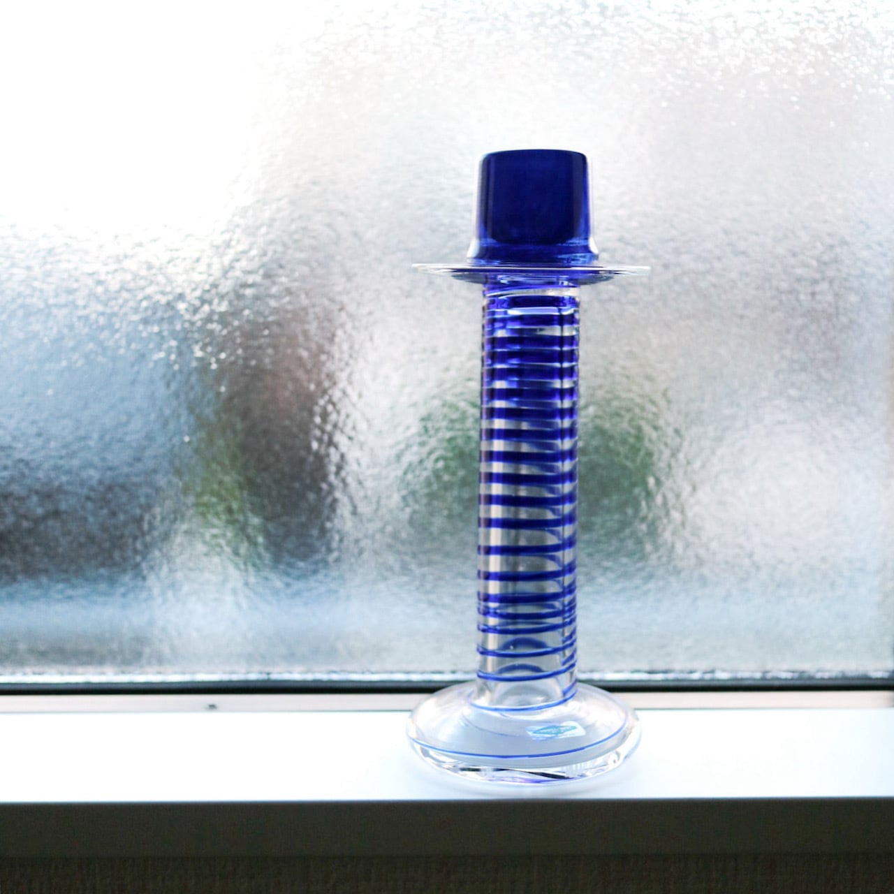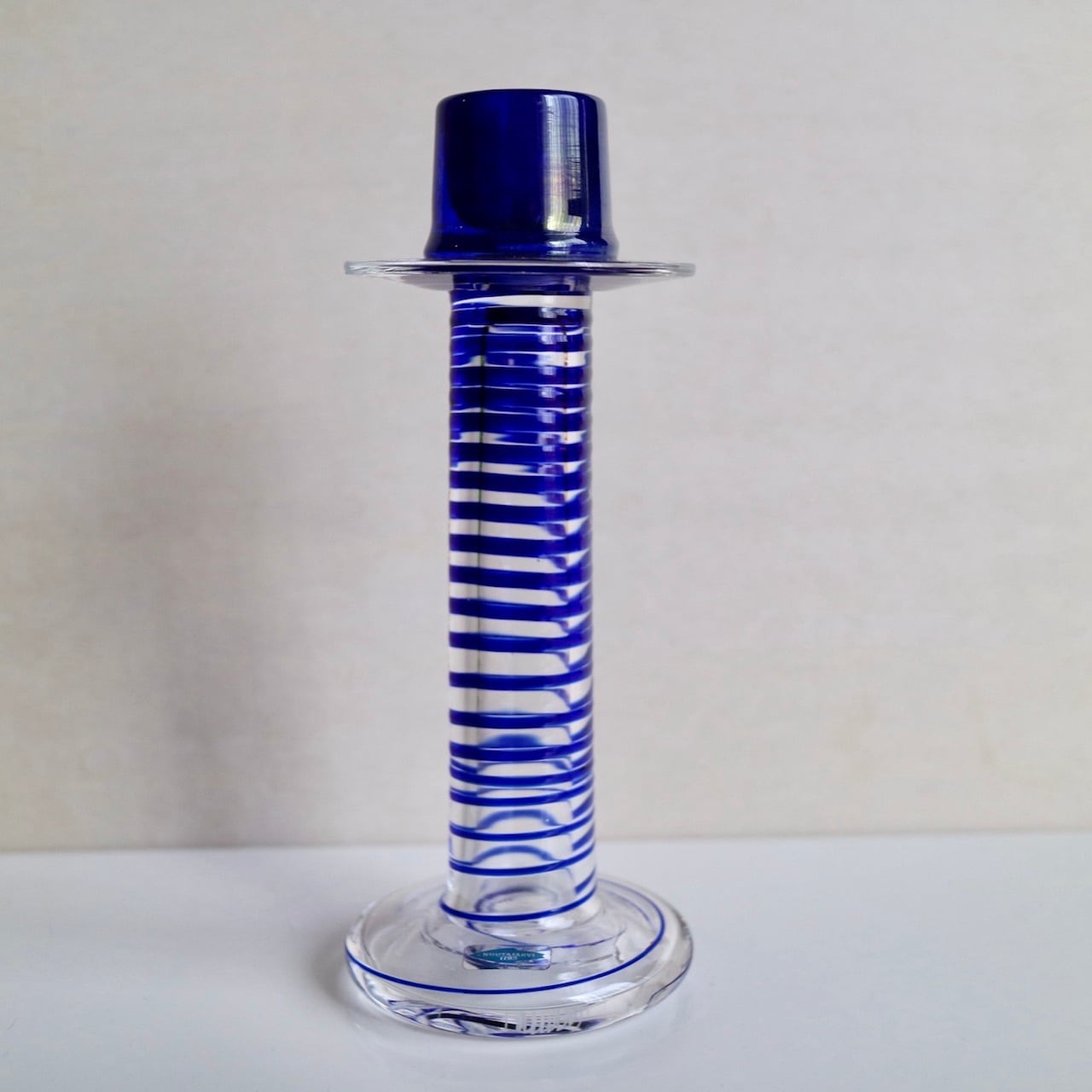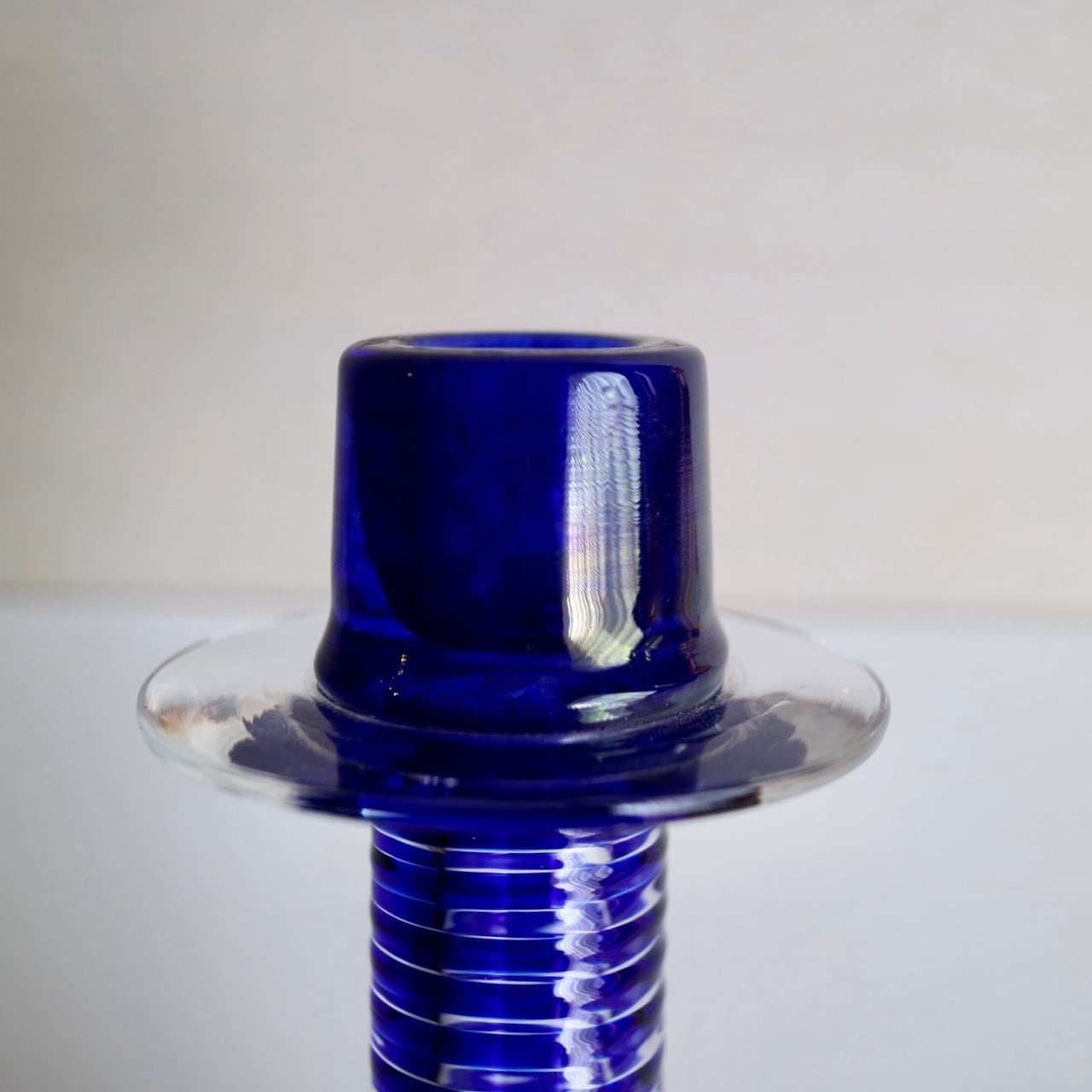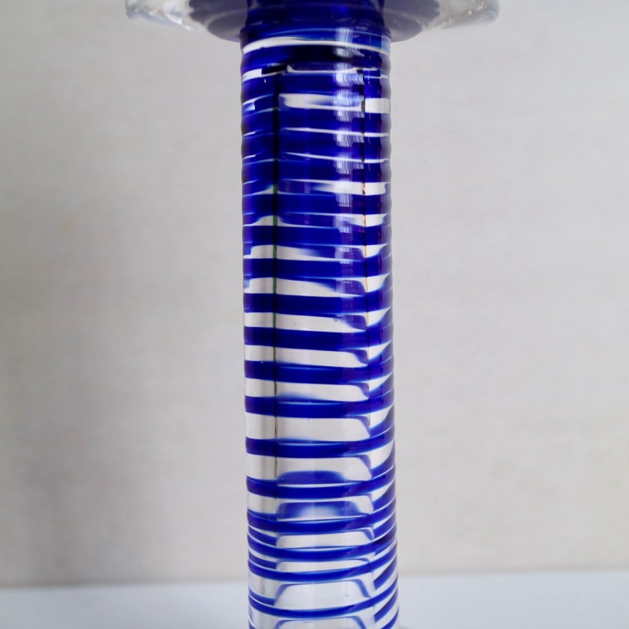 Nuutajarviの中でアートピースを展開していたPro Arteコレクションのうちの一つであるPrimoは、Oiva Toikka(オイバ・トイッカ)のデザイン。細長く背の高い姿にまるでシルクハットのような上部を持つフォルムが印象的です。いくつか色や柄のパターンはあったようですが、こちらはクリアベースに螺旋状のブルーの線が閉じ込められています。キャンドルスティックを挿す上部がブルー一色なので、上からだんだんと線が解れていくようでとても幻想的なイメージです。(もちろん逆の可能性もありますね。)