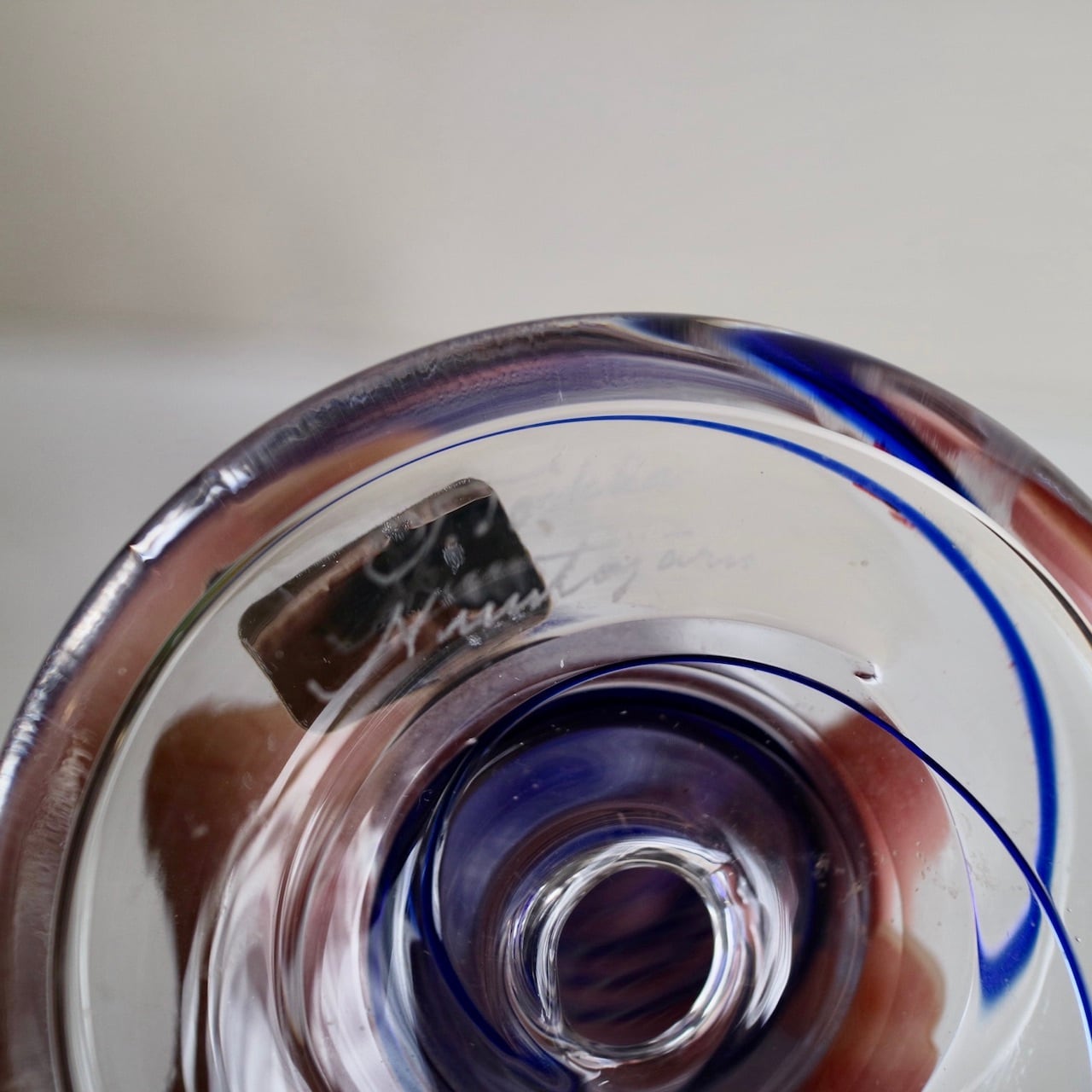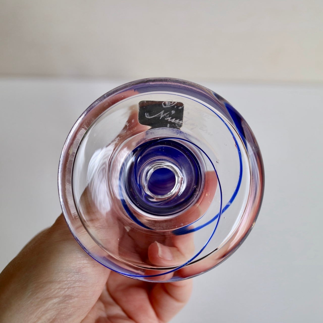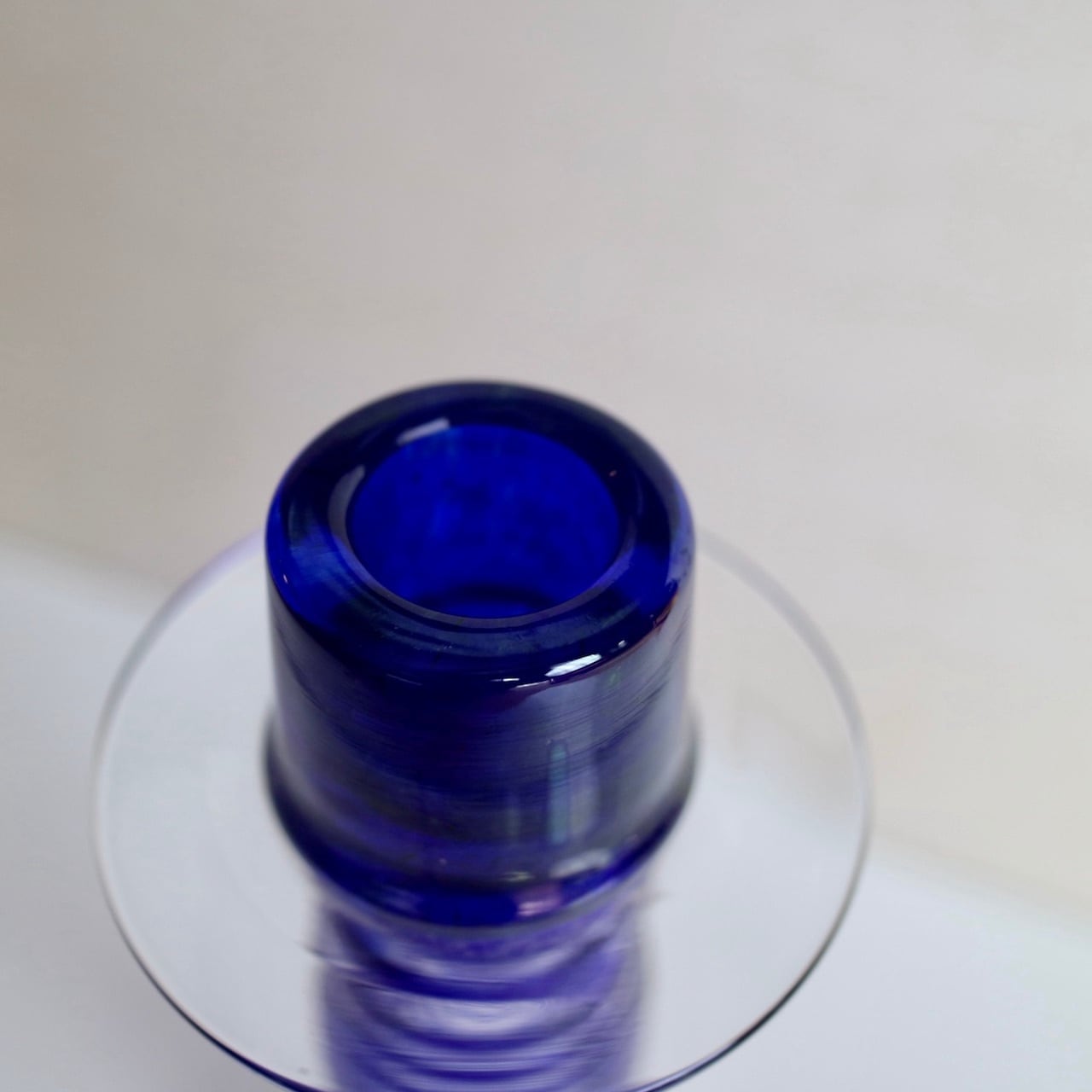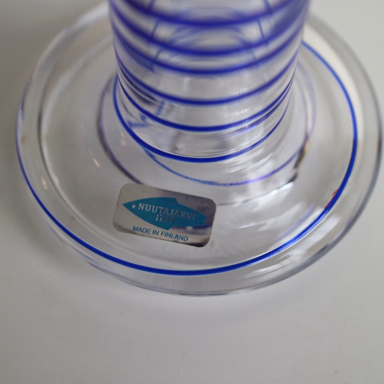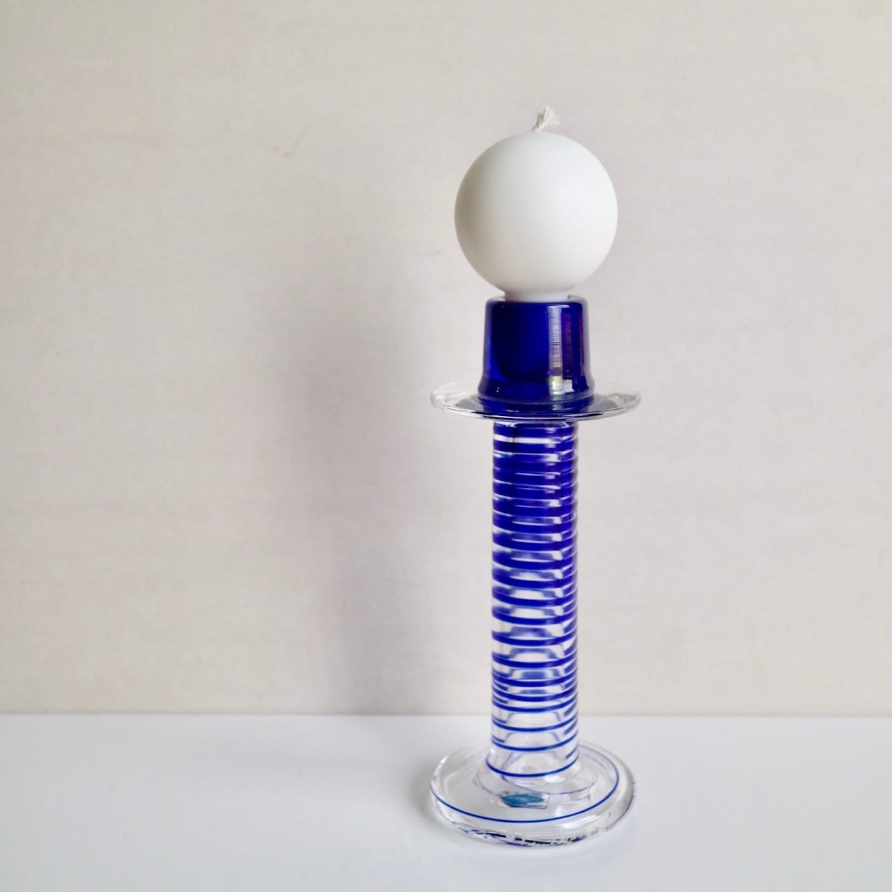 Nuutajarviの中でアートピースを展開していたPro Arteコレクションのうちの一つであるPrimoは、Oiva Toikka(オイバ・トイッカ)のデザイン。細長く背の高い姿にまるでシルクハットのような上部を持つフォルムが印象的です。いくつか色や柄のパターンはあったようですが、こちらはクリアベースに螺旋状のブルーの線が閉じ込められています。キャンドルスティックを挿す上部がブルー一色なので、上からだんだんと線が解れていくようでとても幻想的なイメージです。(もちろん逆の可能性もありますね。)