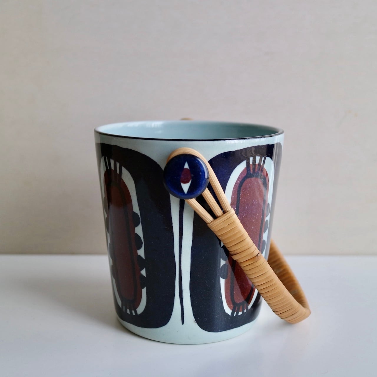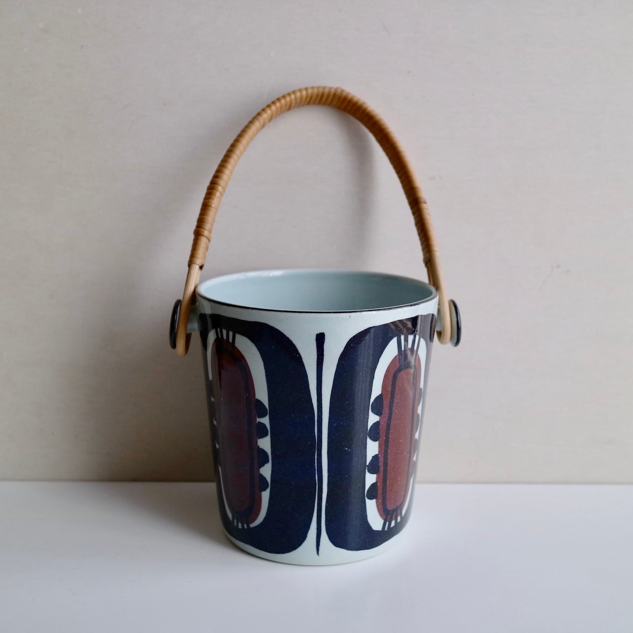 パープルとブルーで描かれた模様が印象的で、持ち手の籐との組み合わせも素敵です。持ち手と本体を繋ぐ部分両サイドにも模様が施され、どこから見ても美しいお品だと思います。花瓶やペン立てなどいろいろな使い方もできるかと思います。