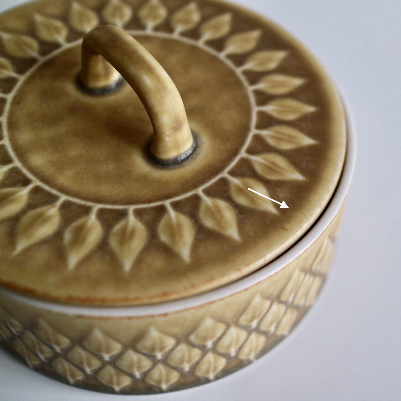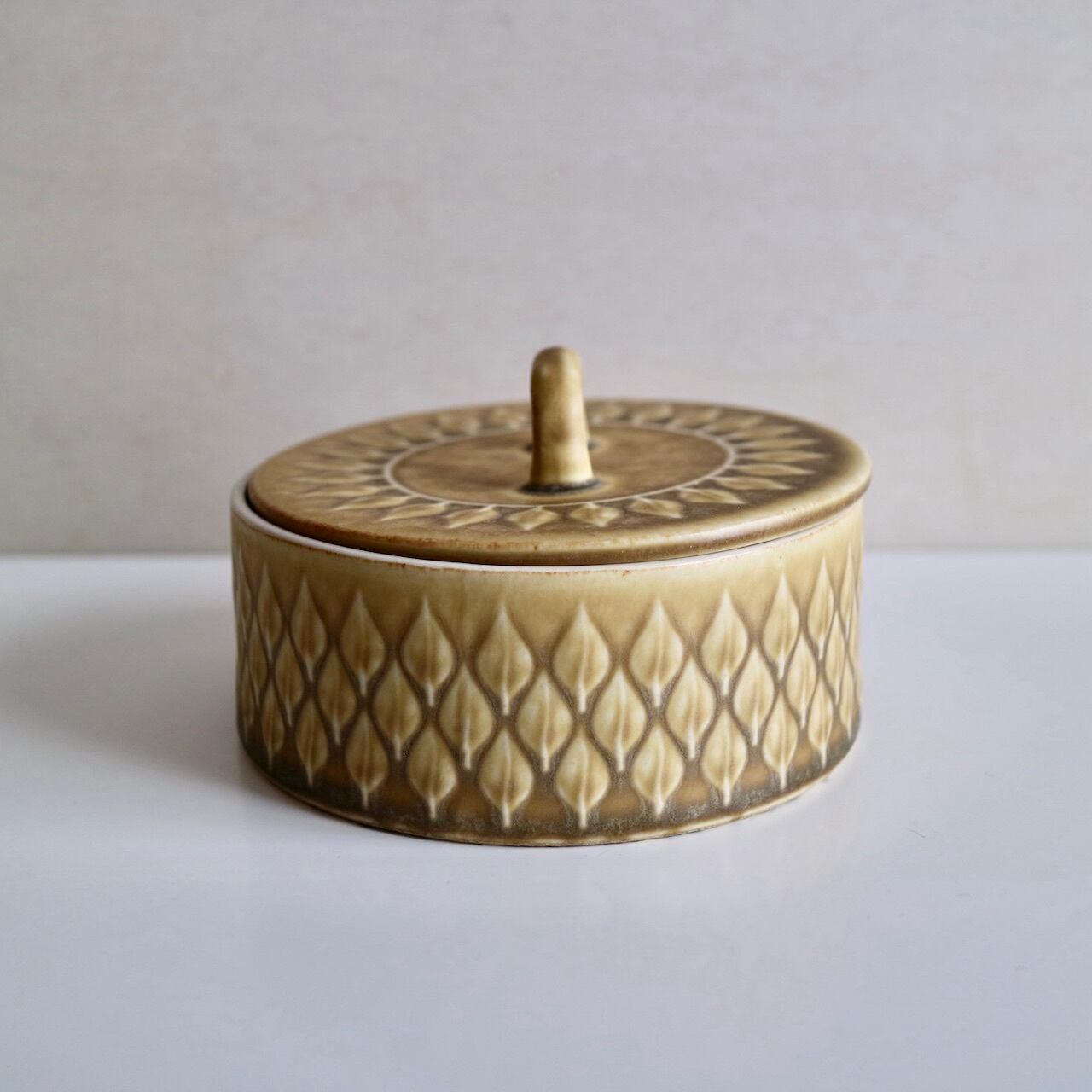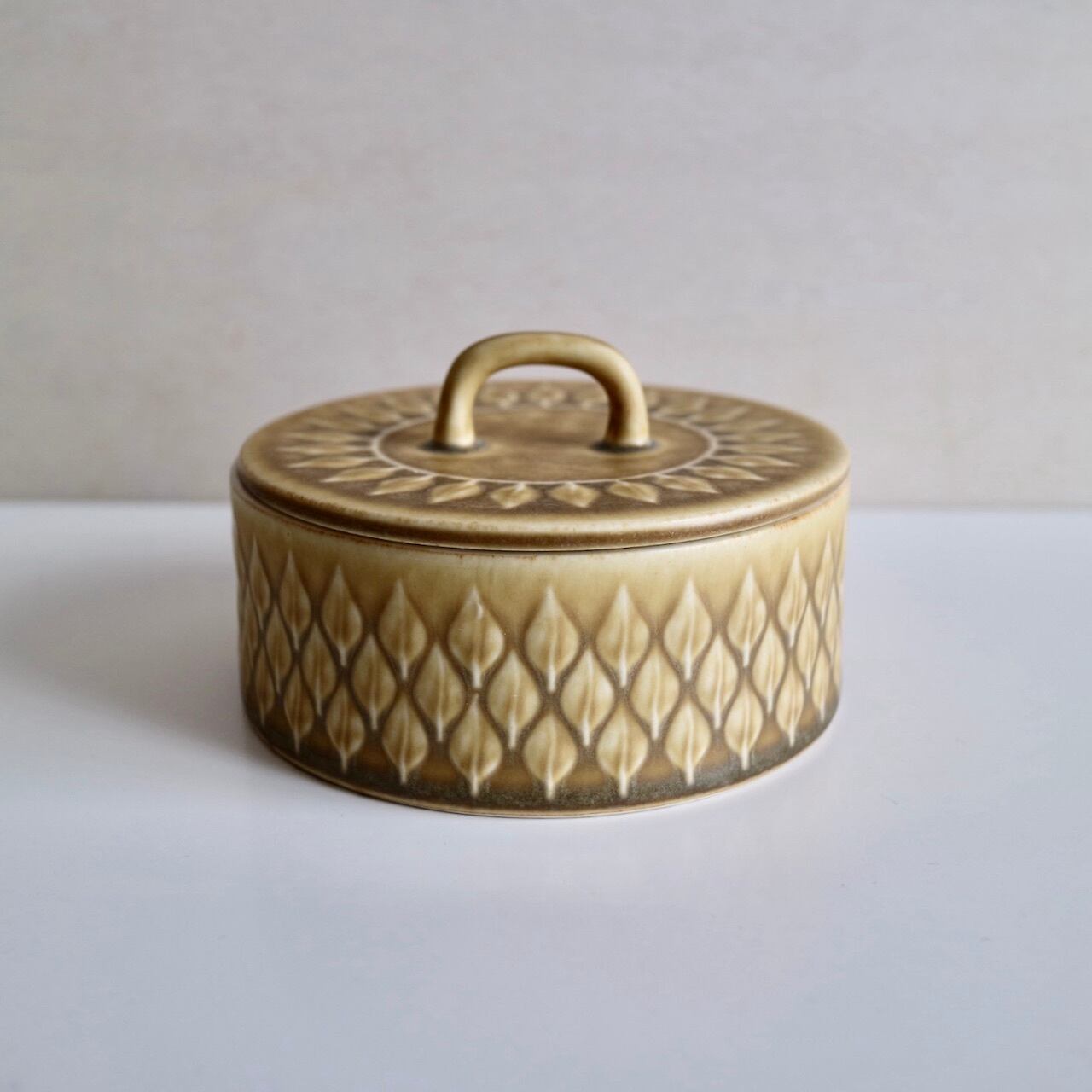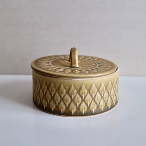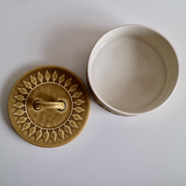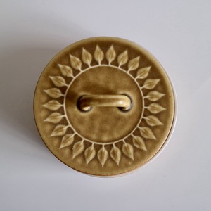 Reliefの名のとおり、黄土色の地の中に葉の模様が立体的に浮かび上がっており、蓋の部分には一周模様が入っていますので、上から見ればなんだか向日葵の花のようにも見えるお品です。浅く広い入れ物ですので、小物入れとしても素敵だと思います。