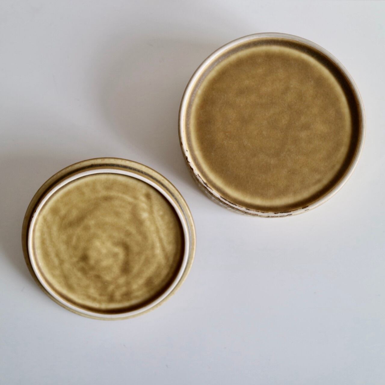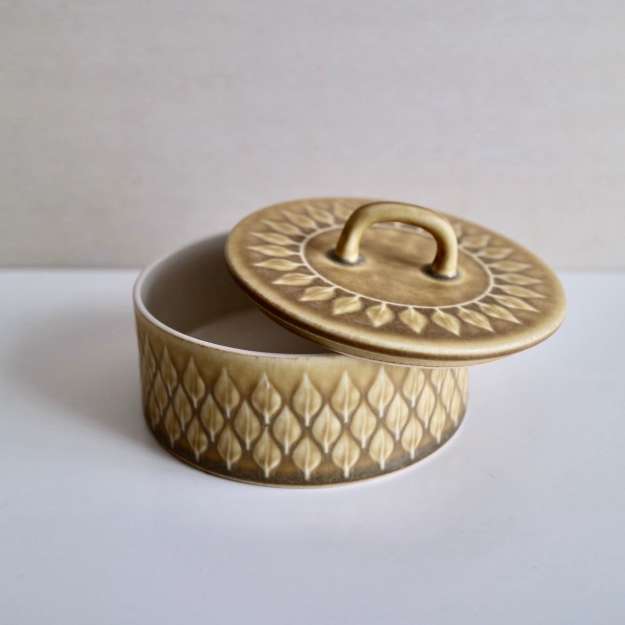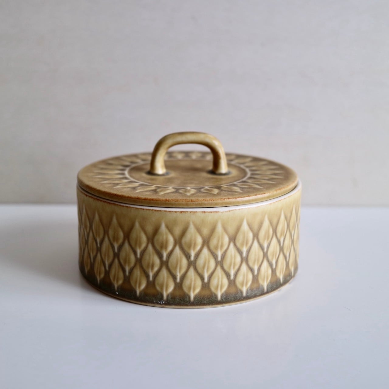 Reliefの名のとおり、黄土色の地の中に葉の模様が立体的に浮かび上がっており、蓋の部分には一周模様が入っていますので、上から見ればなんだか向日葵の花のようにも見えるお品です。浅く広い入れ物ですので、小物入れとしても素敵だと思います。