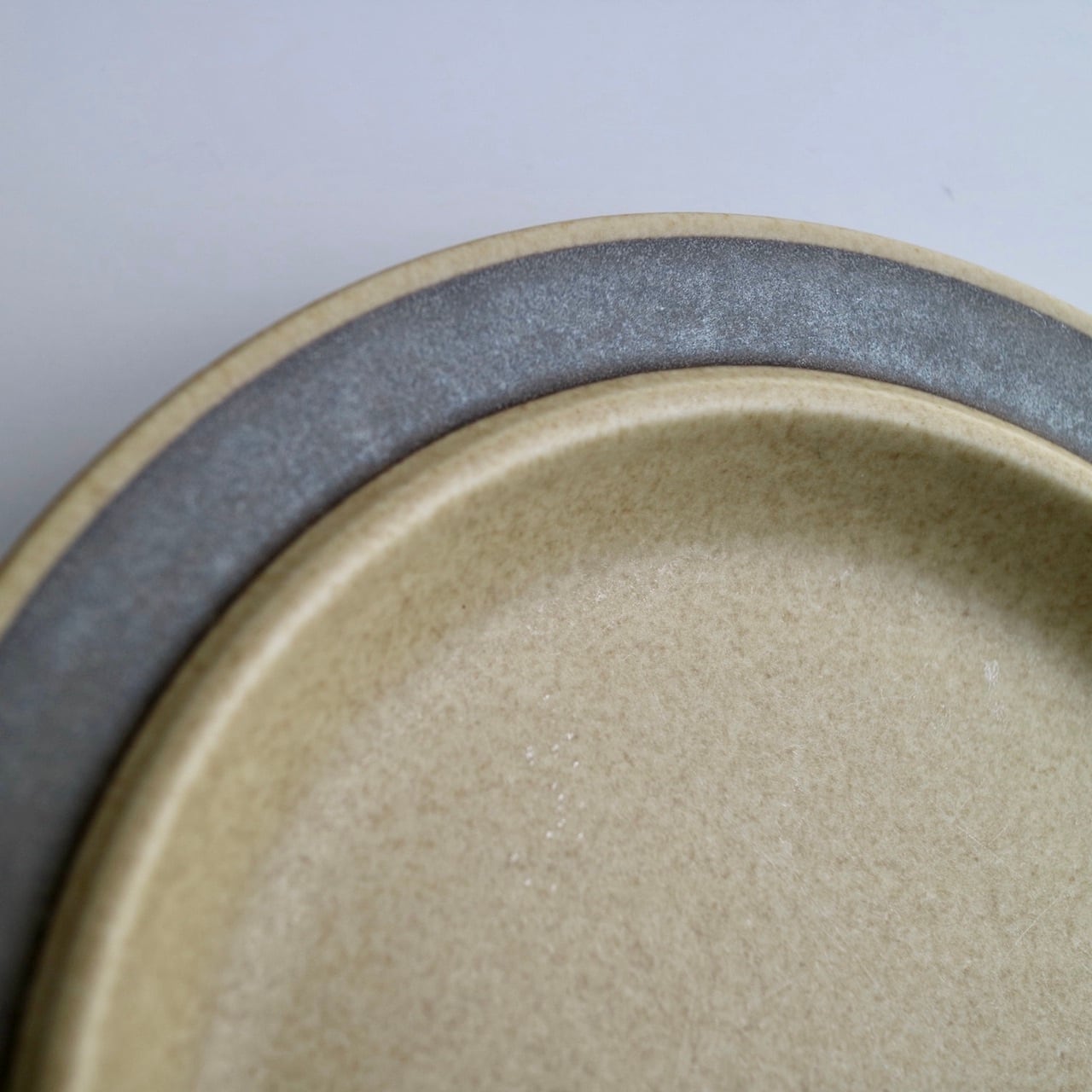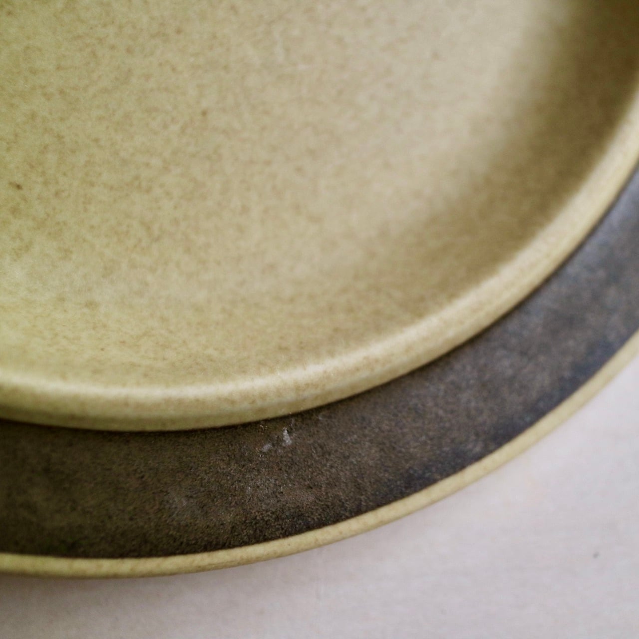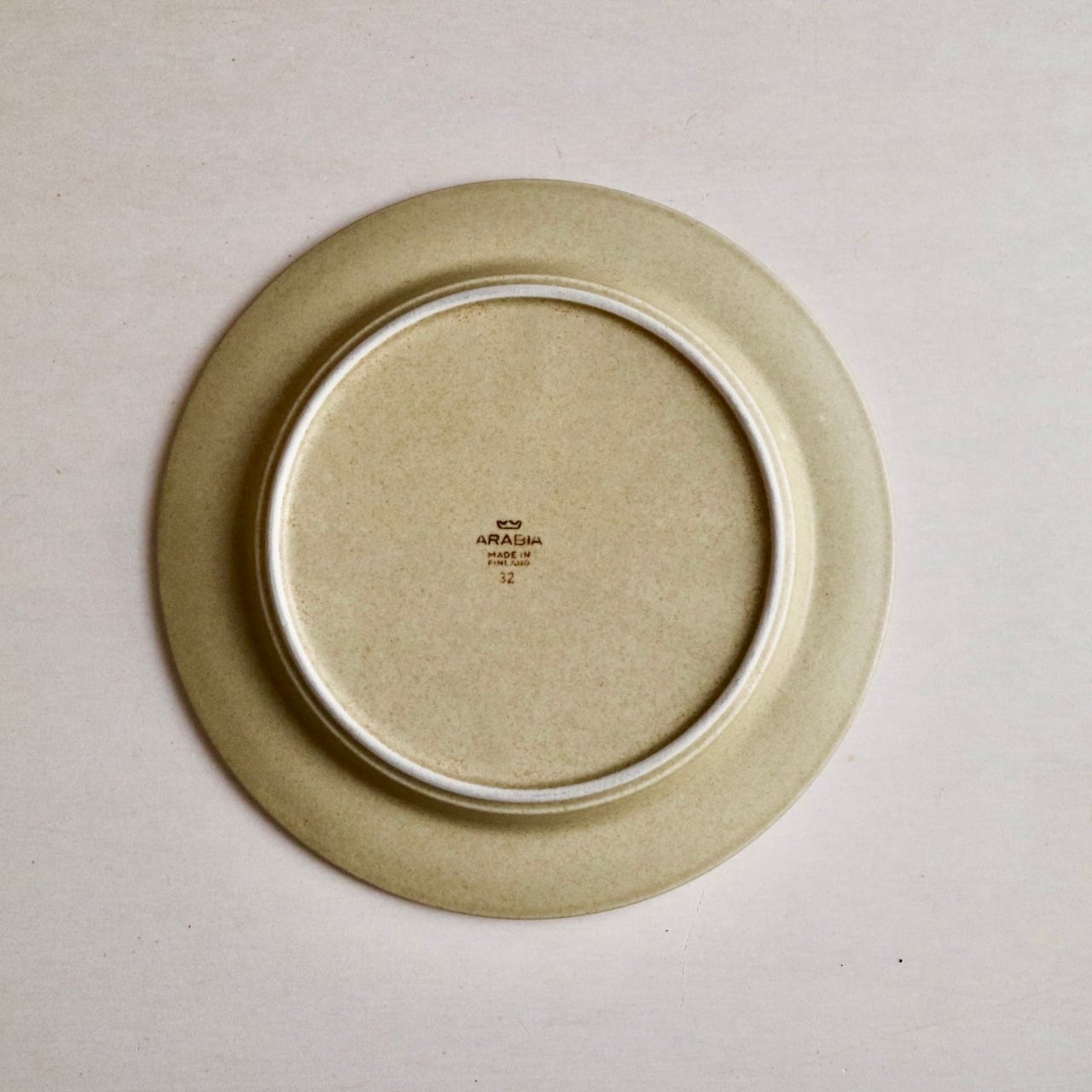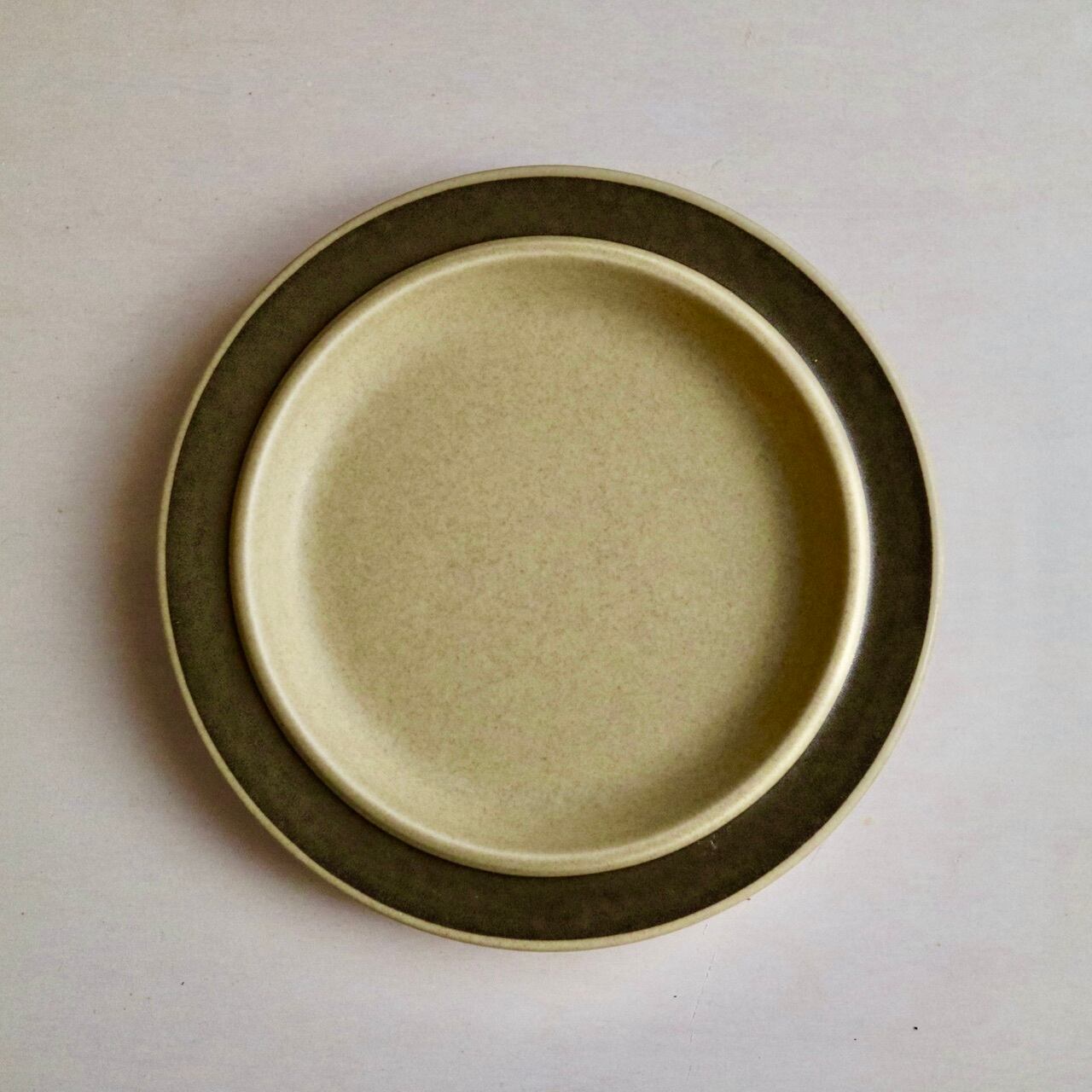 フィンランド、ラップランド地方の丘や小山を指すTunturi。黄土色のような素地に、リムの部分をブラウンのラインで彩ったプレートです。ブラウンと言っても、見る角度によってはシルバーが入っているかの如くグレーっぽく少し輝くような色味にも感じられるのがとても面白いです。カップなどは側面にブラウンの花が大きく描かれていますが、プレートはシンプルにラインのみ。艶はなくマットな風合いも素敵で、Ruskaシリーズに近いものがあります。フォルムはUlla ProcopeデザインのSモデルです。