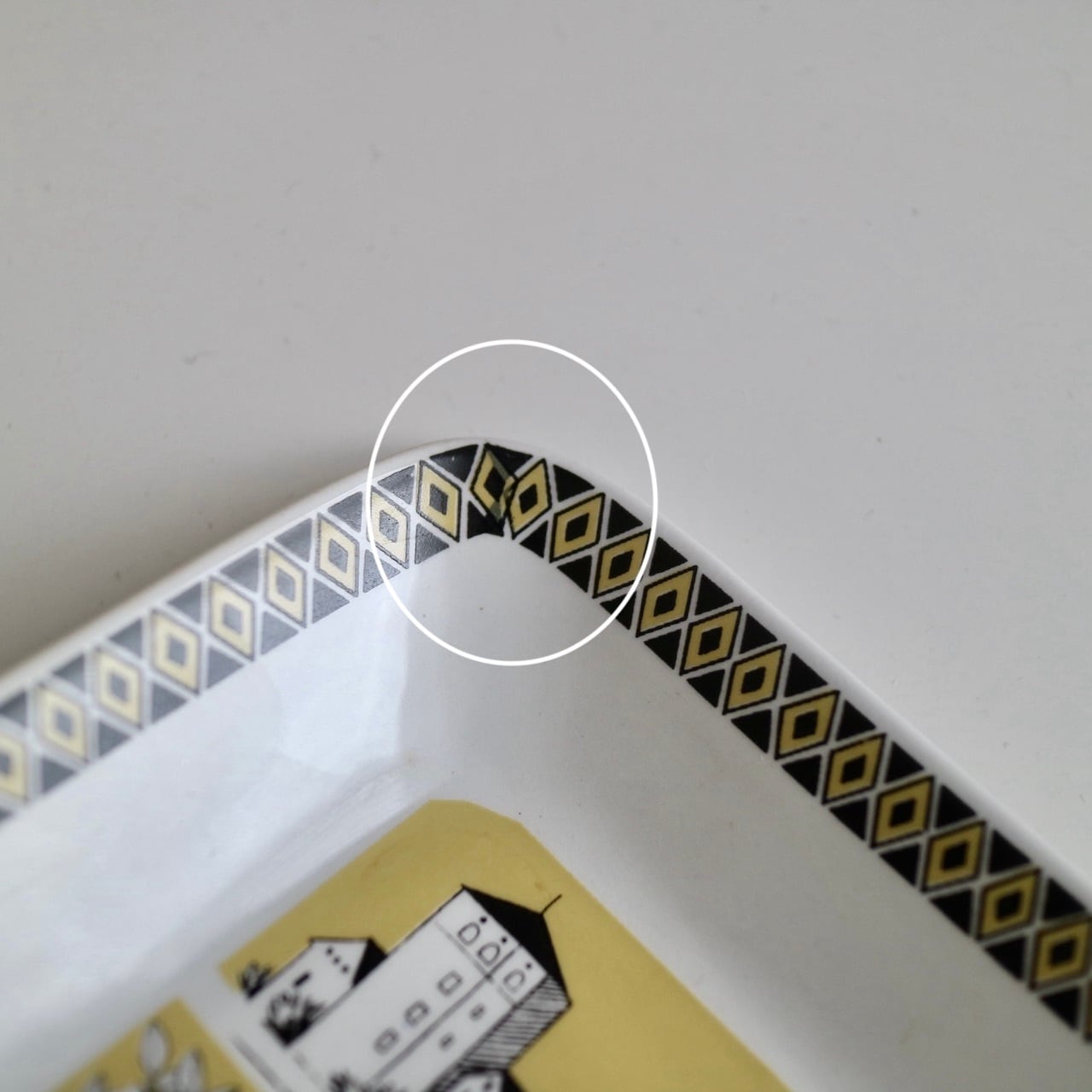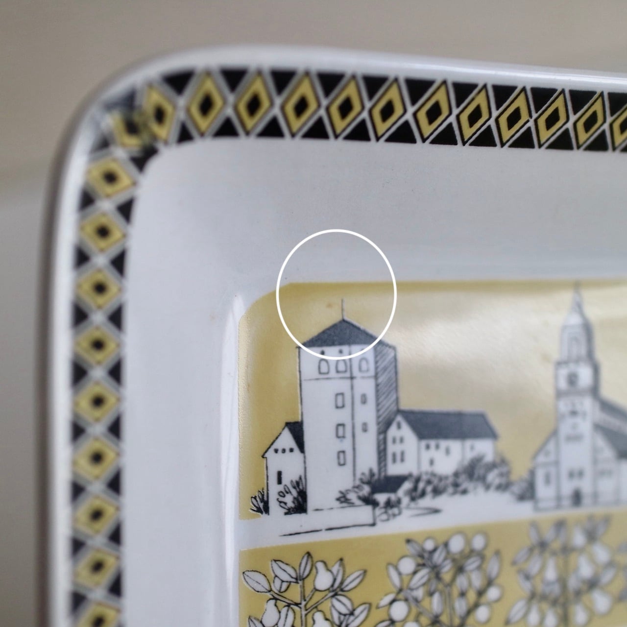 実際に使われていたお品ですので、キズやプリントロス、汚れなど見られますがヒビやチップはありません。製造時からのものとして、プリントミス、黒点などが見られます。全体的には綺麗な方かと思いますので、ヴィンテージ品としては良好な状態です。なお、底裏に数カ所丸い跡のようなものが見られますが、こちらは重ねて焼く際に支柱を置いたことでできる跡です。