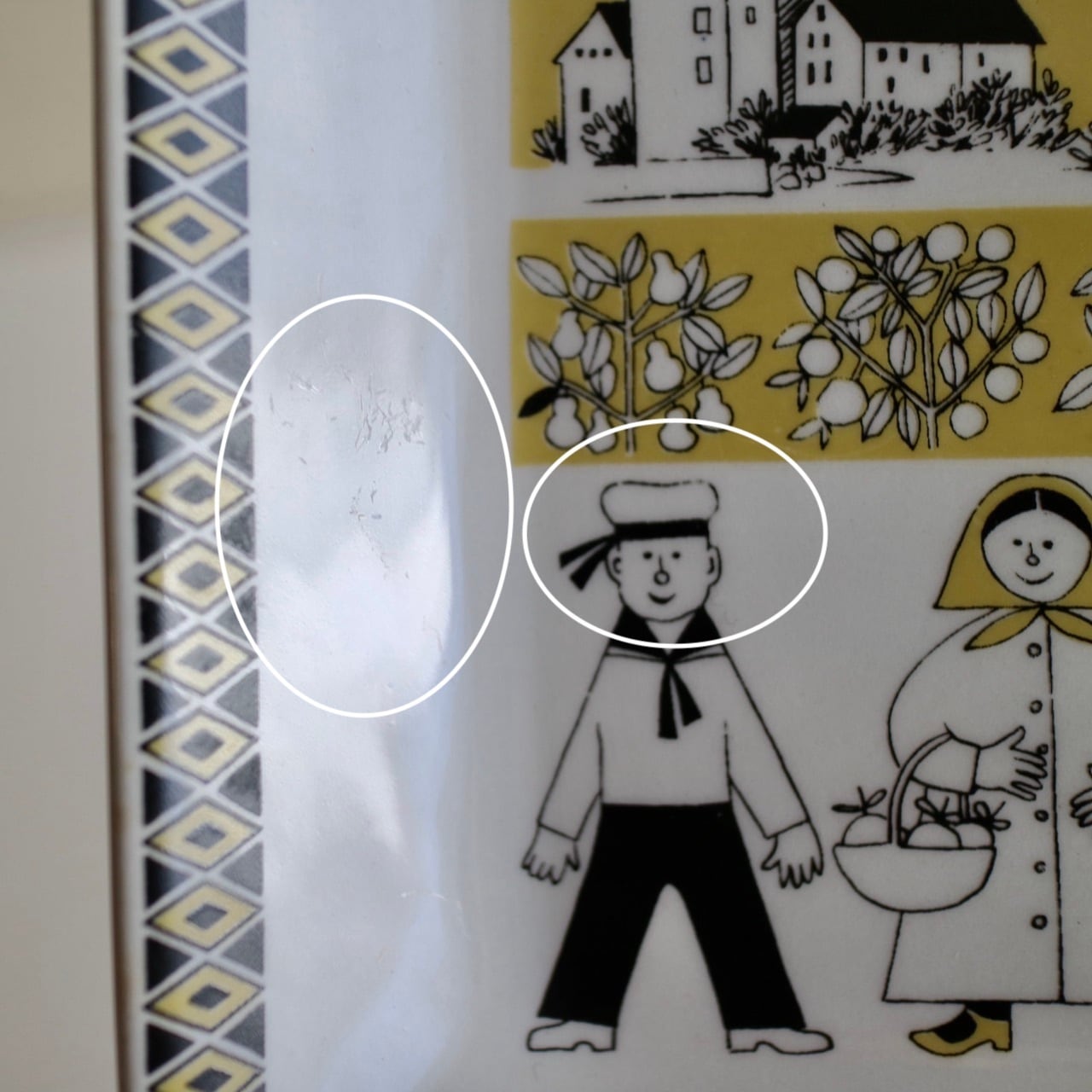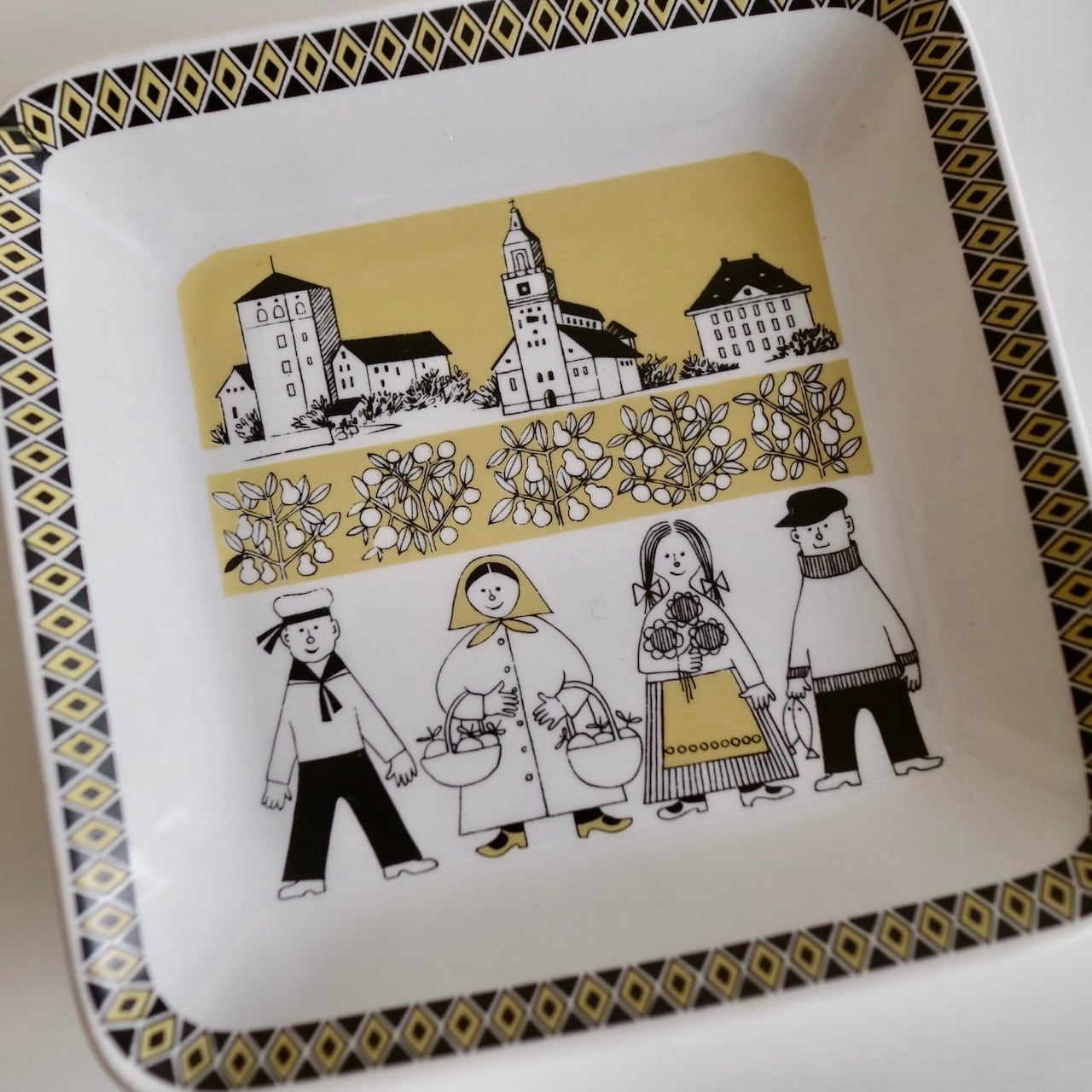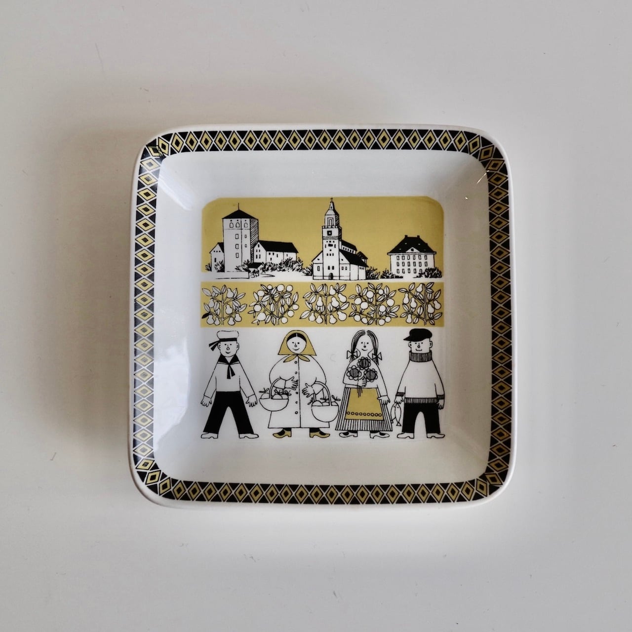 プレートにはフィンランドの南西に位置するためか少し暖かな雰囲気の服装で、花や果物、そして船乗りの姿も描かれています。トゥルク大聖堂と思われる建物などが描かれていますね。たまご色のような柔らかいイエローと黒が印象的です。