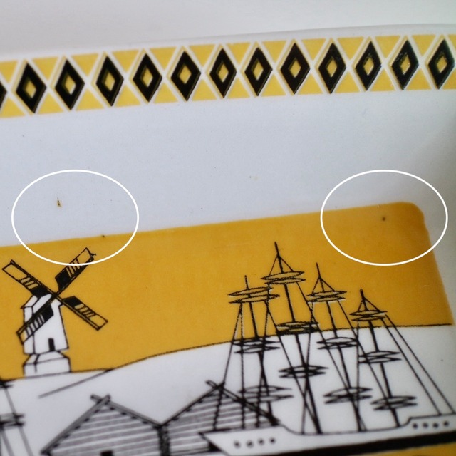 実際に使われていたお品ですので、キズやプリントロス、汚れなど見られますがヒビやチップはありません。製造時からのものとして、釉薬ムラや黒点などが見られます。高台部分に釉薬ムラによる微細な貫入がありますが、よく見ないとわからない程度なので気にならないかと思います。全体的には綺麗な方かと思いますので、ヴィンテージ品としては良好な状態です。なお、底裏に数カ所丸い跡のようなものが見られますが、こちらは重ねて焼く際に支柱を置いたことでできる跡です。