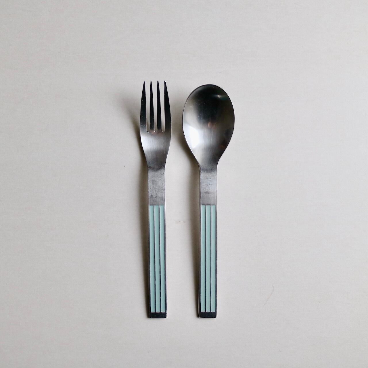 真っ直ぐのハンドルに3本のカラーラインが入っているデザインのカトラリーシリーズです。(柄は表面のみ)スプーンとフォークをぴったり重ねることもできるようなフォルムです。日本製。