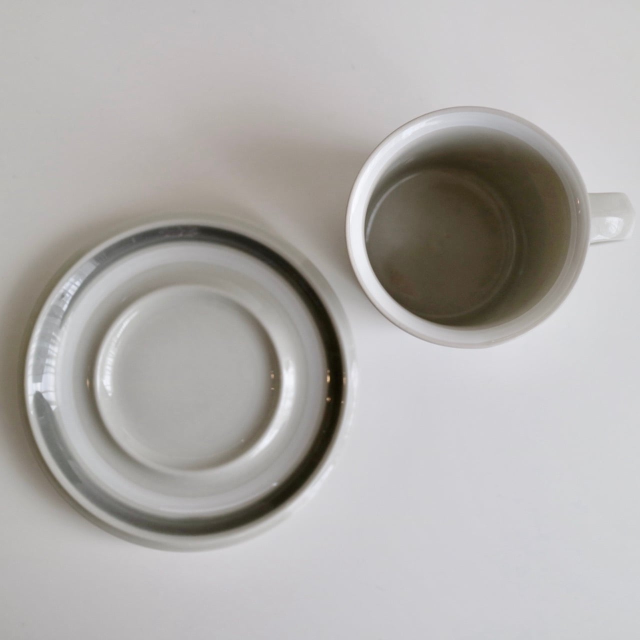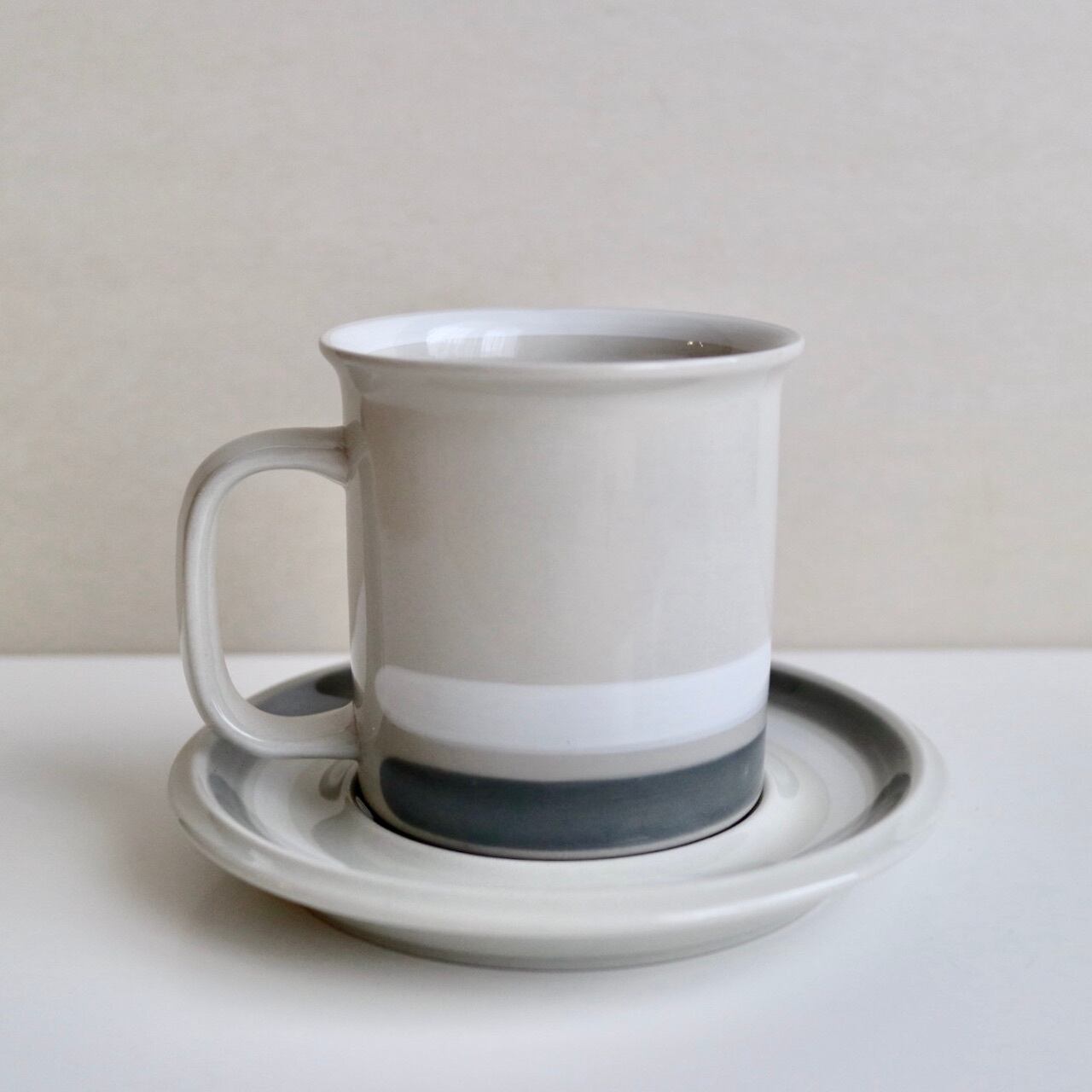 グレーと白のラインが側面にひかれたSallaシリーズ。よく見ると、カップの内側の縁にも白い線がひかれています。シンプルですが、ベージュグレーの素地とも調和した全体的に優しい色遣いが素敵なお品です。