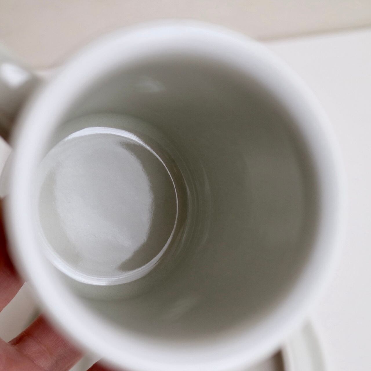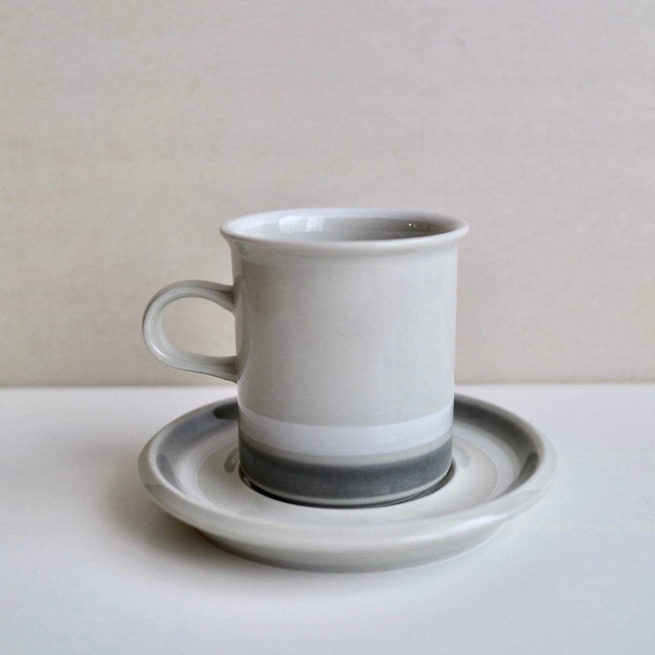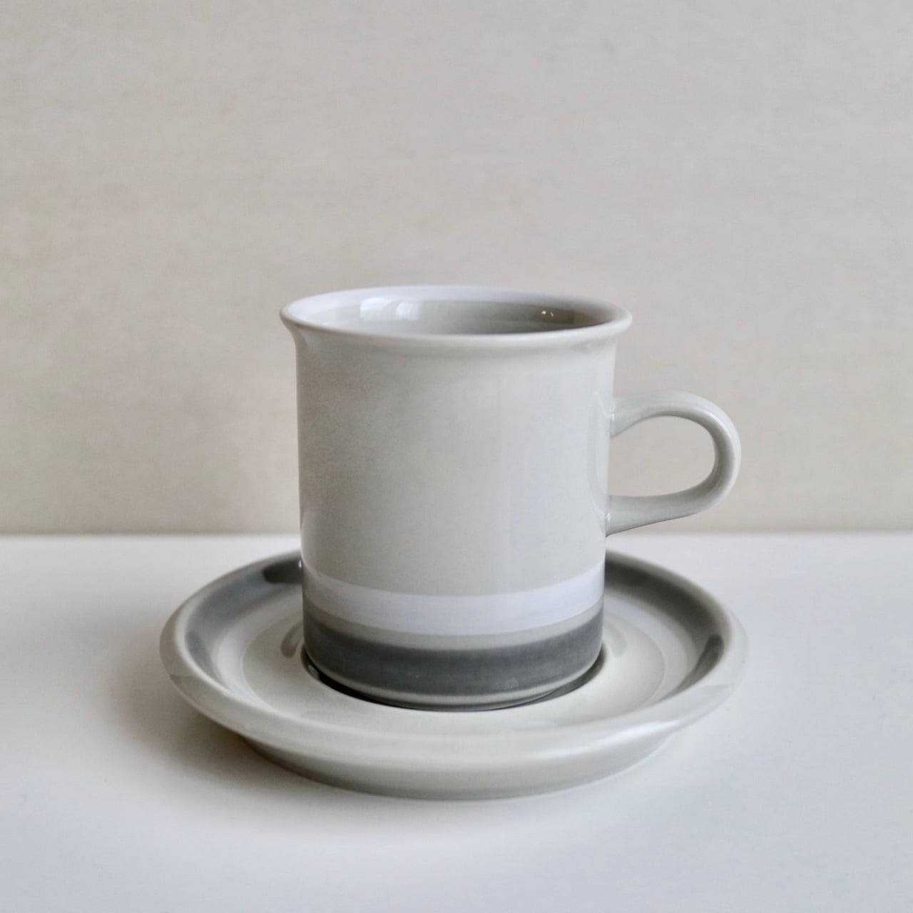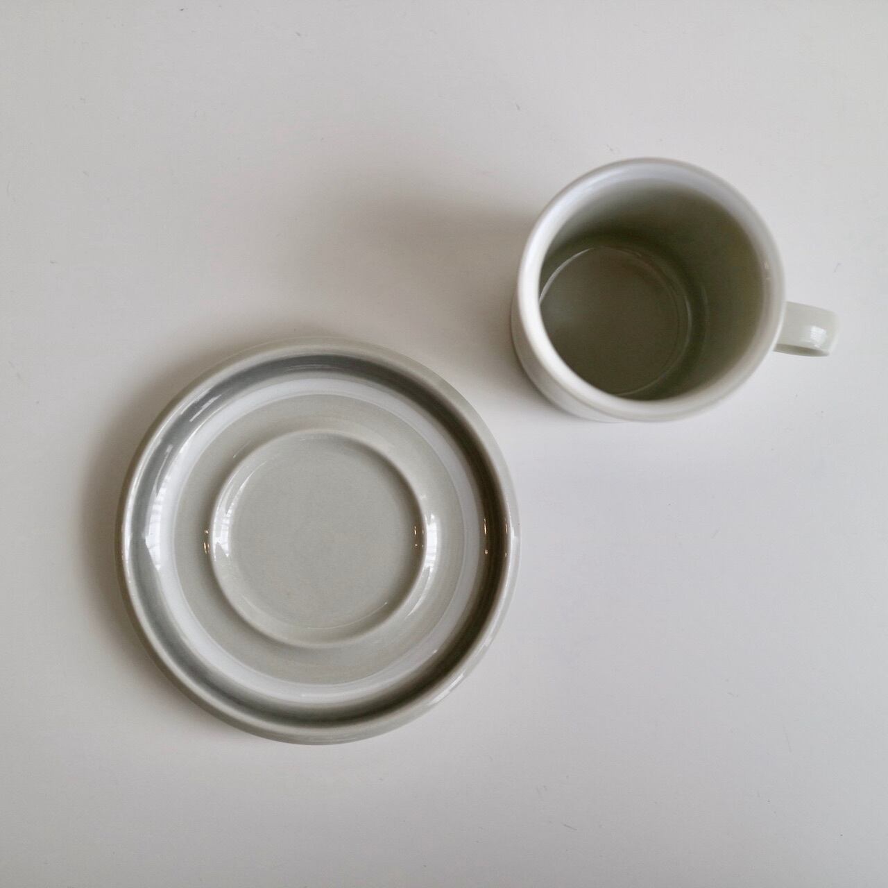グレーと白のラインが側面にひかれたSallaシリーズ。よく見ると、カップの内側の縁にも白い線がひかれています。シンプルですが、ベージュグレーの素地とも調和した全体的に優しい色遣いが素敵なお品です。こちらは細長いコーヒーカップタイプで、フォルムはUlla ProcopeデザインのSモデルです。