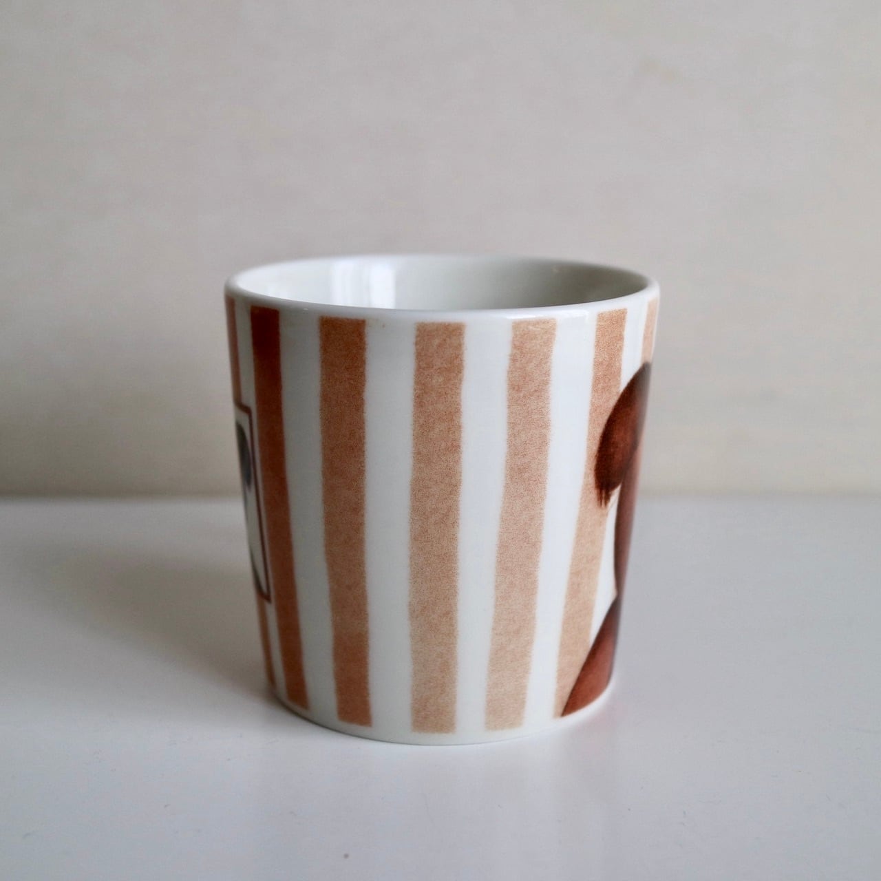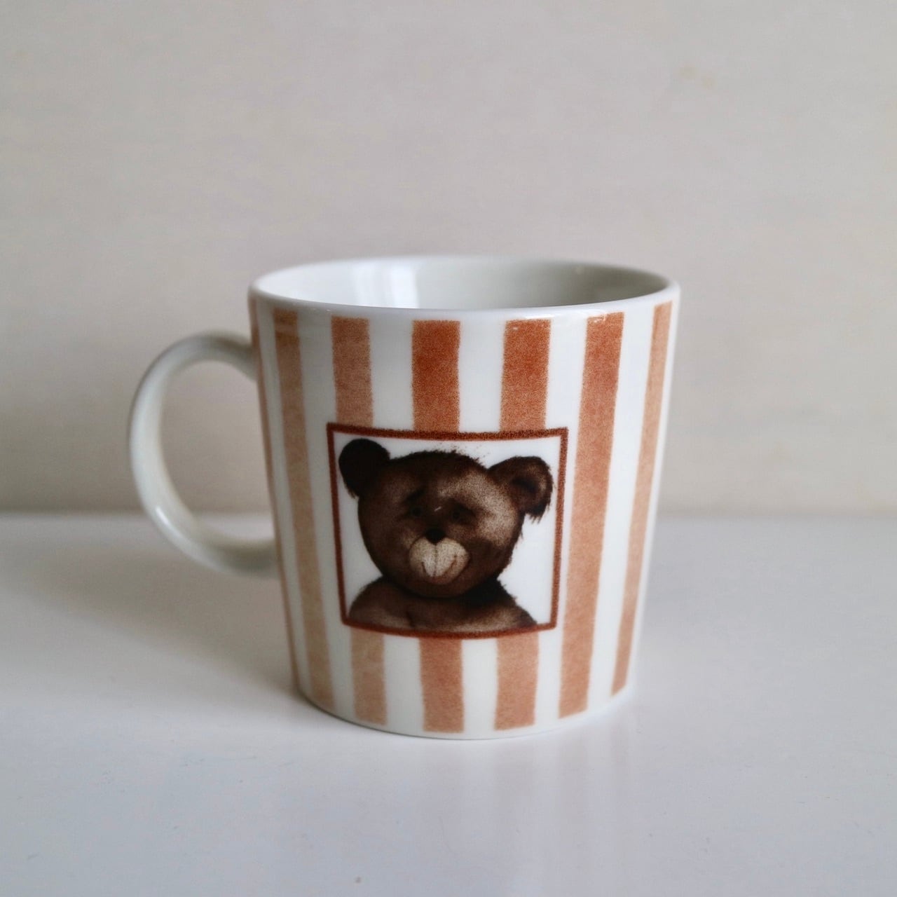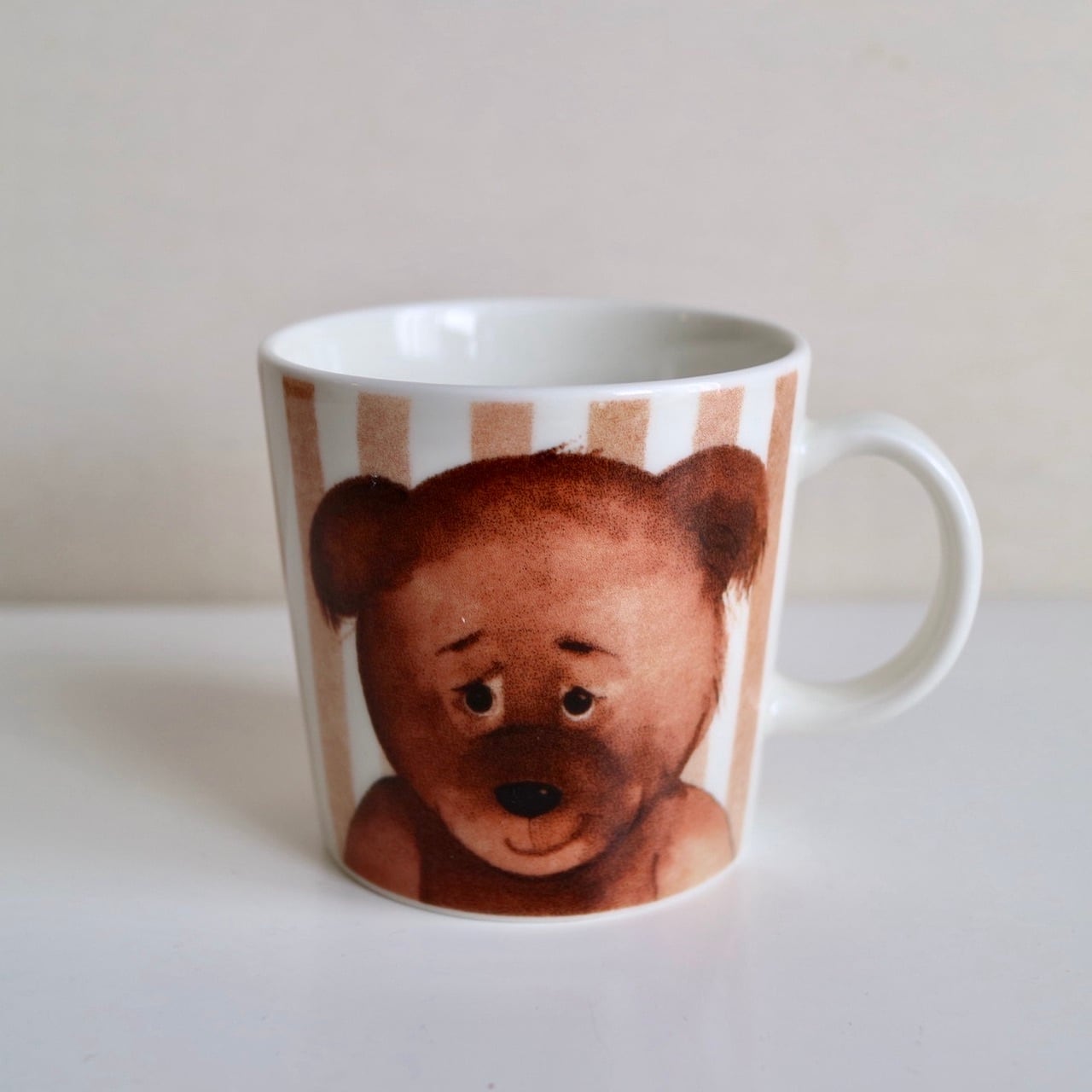 2005年、4種類のテーマに沿ったクマを描いたマグが発売されましたが、こちらはそのうちの一つ、「Sulo(魅力)」です。茶色のストライプの中に、眉毛を下げた可愛らしい顔が印象的なクマさんが描かれた素敵なお品です。