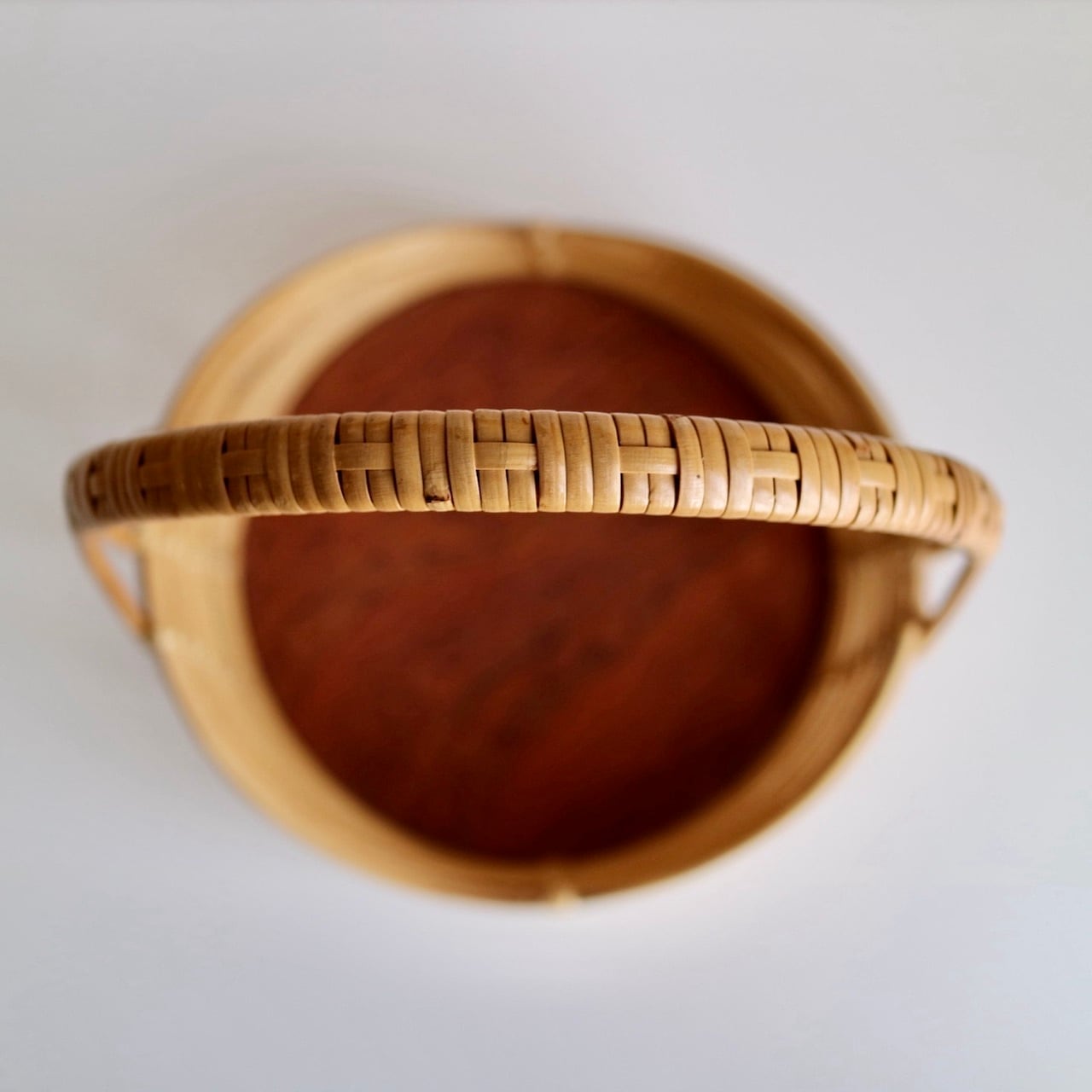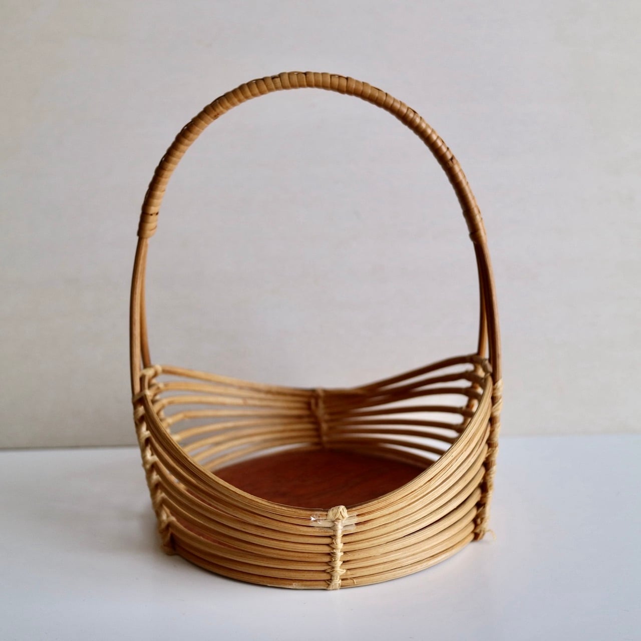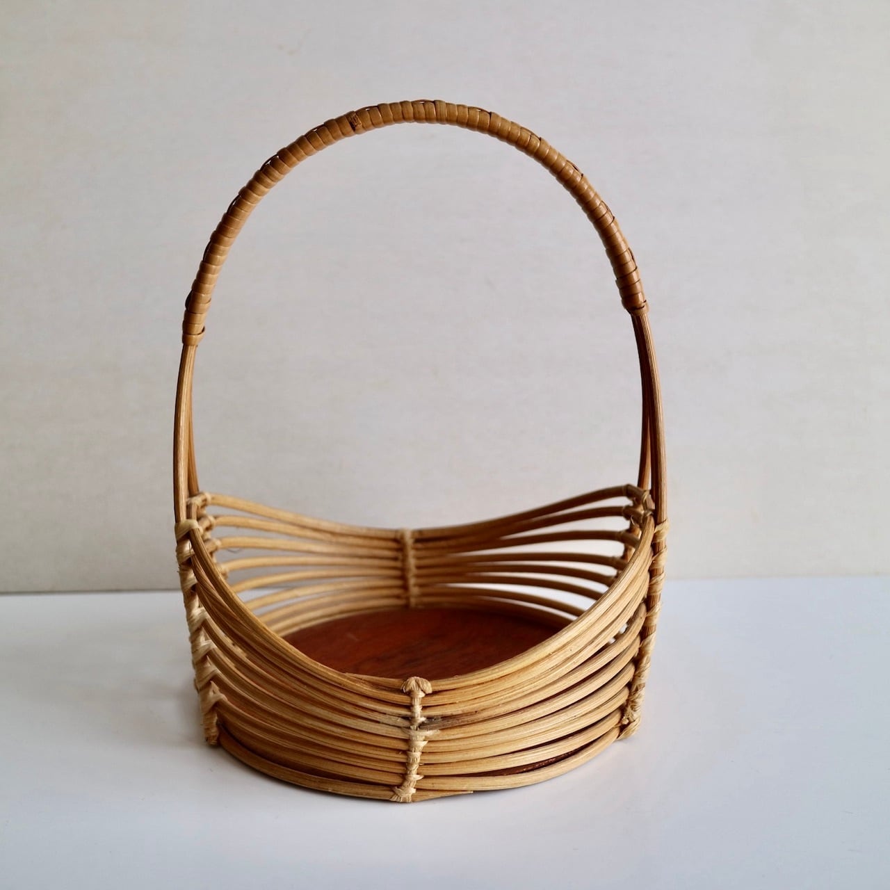 籐の持ち手とウェーブがかったようなラインが美しいサイドに、チーク突板の底板が組み合わせられたバスケットです。小さめサイズですので、キャンドルホルダーやヴェースを合わせてチェストの上に飾ったりするのもおすすめです。なお、底板は接着しているだけですので、何かを入れて持ち歩くのには向かないかと思います。