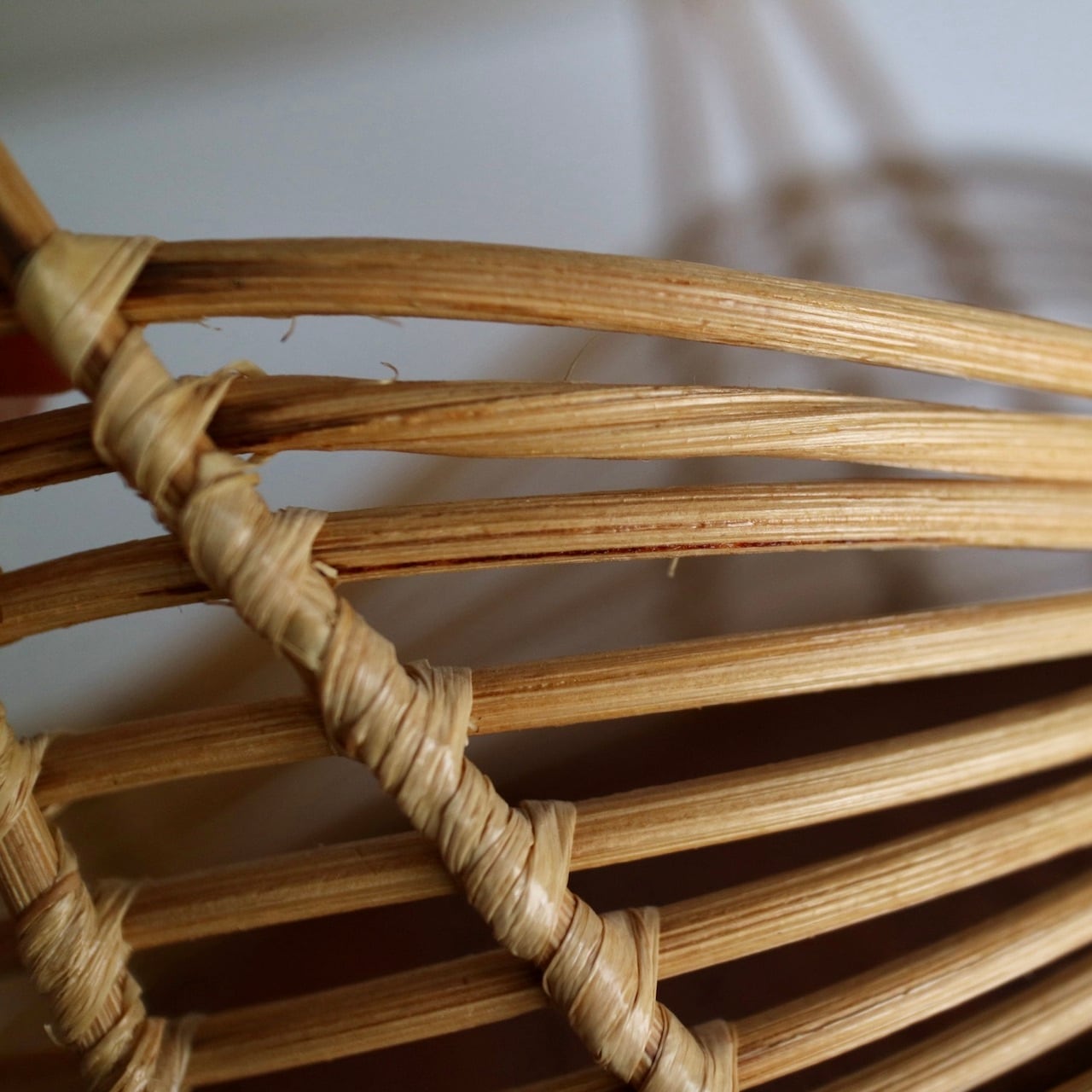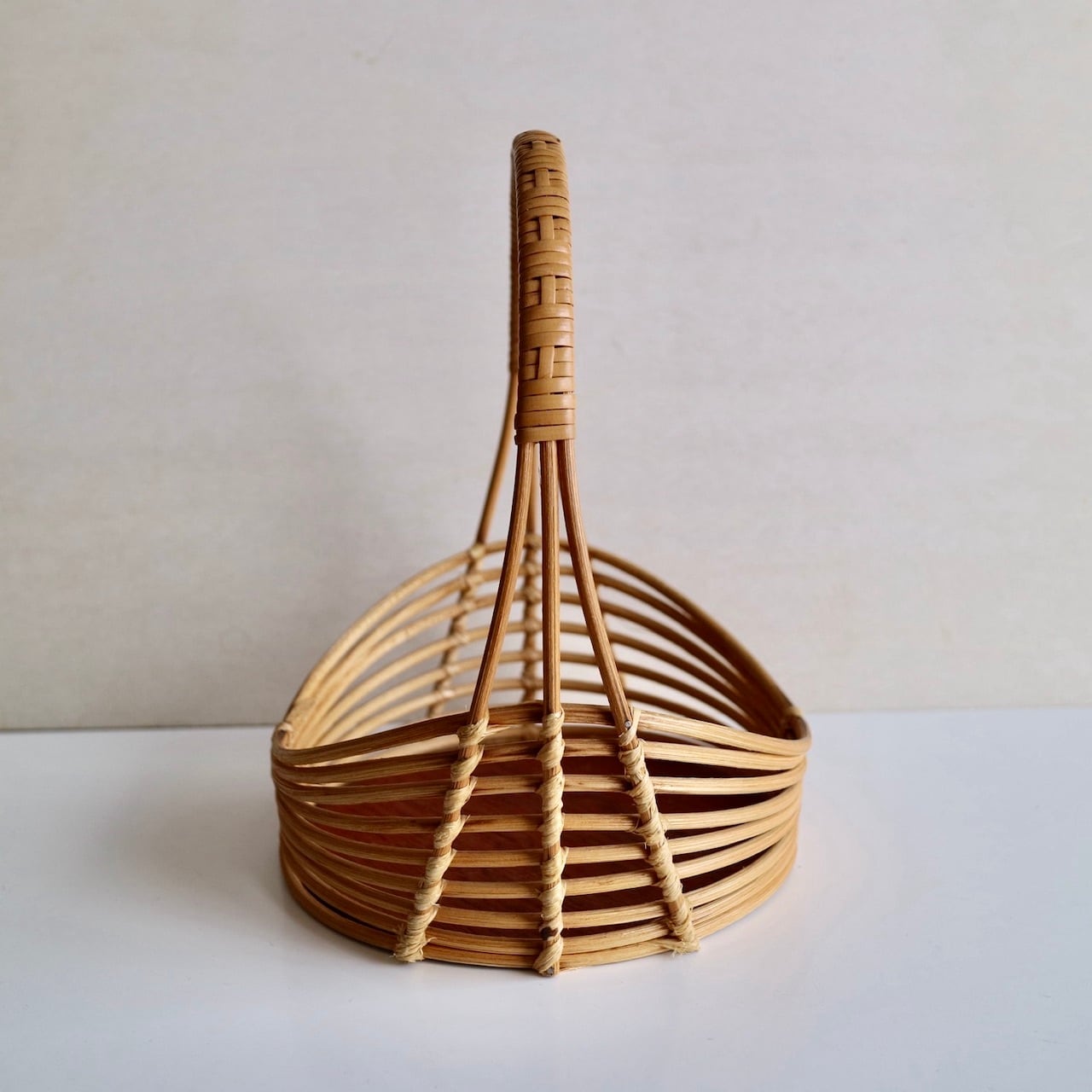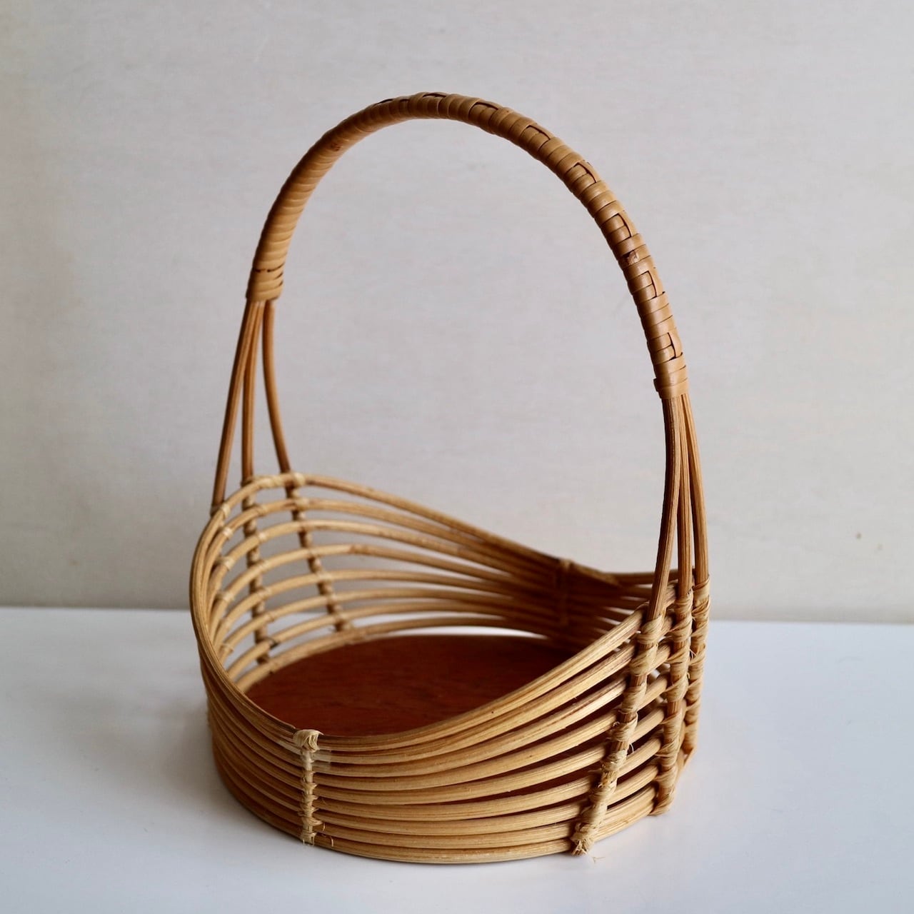 籐の持ち手とウェーブがかったようなラインが美しいサイドに、チーク突板の底板が組み合わせられたバスケットです。小さめサイズですので、キャンドルホルダーやヴェースを合わせてチェストの上に飾ったりするのもおすすめです。なお、底板は接着しているだけですので、何かを入れて持ち歩くのには向かないかと思います。