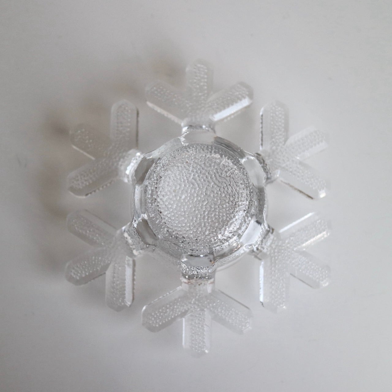 雪の結晶を模した形が素敵なキャンドルホルダー。上から見ればまさに雪の結晶です。カットや裏側の模様が陽の光などでもきらめいてとても綺麗ですが、キャンドルを入れての美しさも格別。人気があるのも頷ける逸品です。