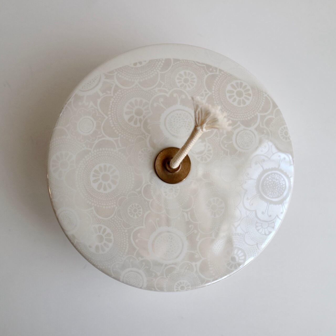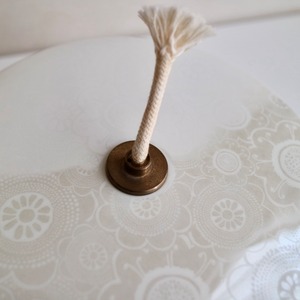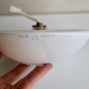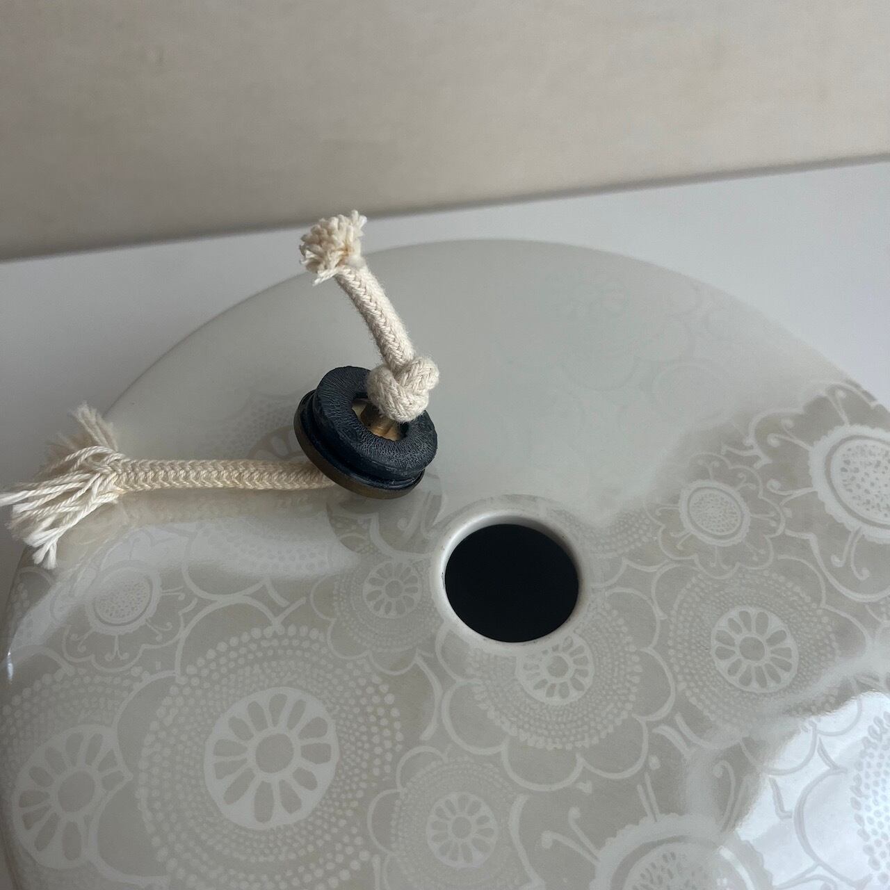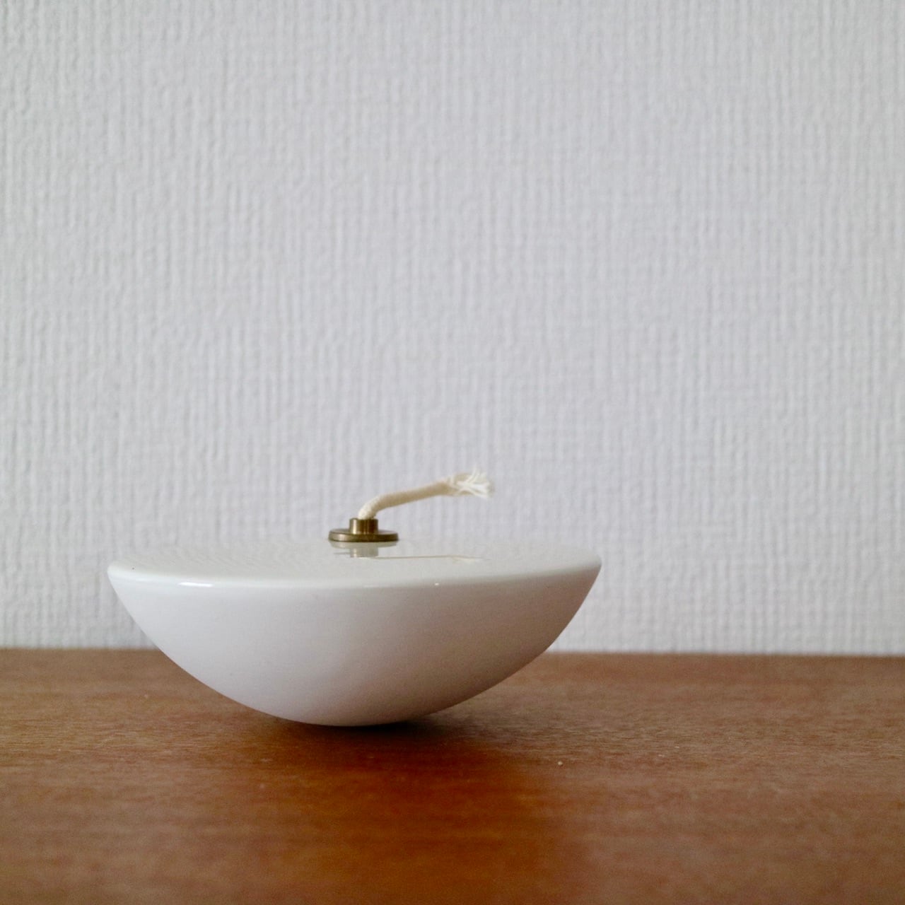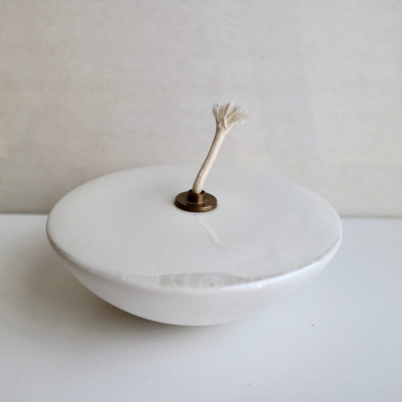 フィンランド語で真珠を意味するHelmi。白く丸い半球のようなフォルムを持ち、上部には少しクリーム色に真珠の如く独特の輝きを放つ白い花柄模様が施されたオイルランプです。形としては不安定ではありますがひっくり返らないように作られています。このゆらゆら揺れる様が、よりHelmiの美しさを際立たせているような気がします。芯の部分は金具ごと引き抜いて取り外すことができます。