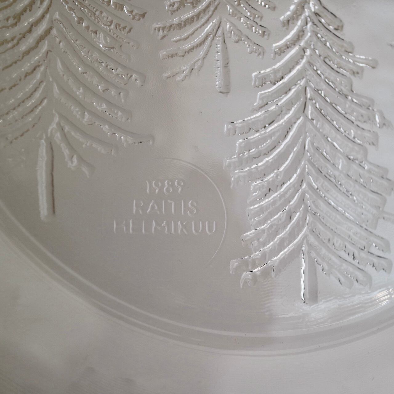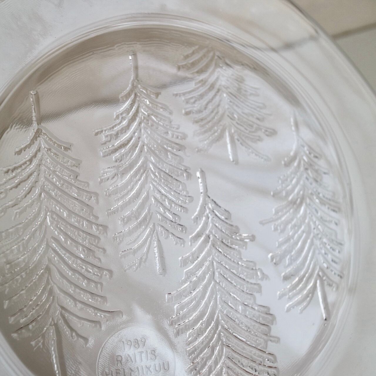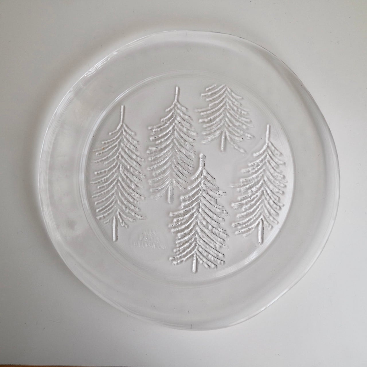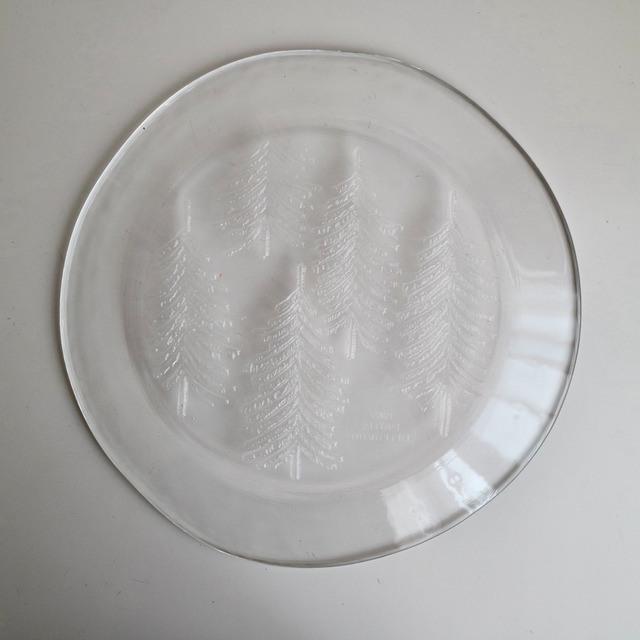 ほぼフラットなプレートにフィンランドらしいもみの木(厳密にはkuusi=トウヒの木)が装飾されており、またプレートの縁も綺麗な曲線ではなく手作りのようなライン。氷の中に閉じ込めたもみの木のような雰囲気でとても素敵な1枚です。