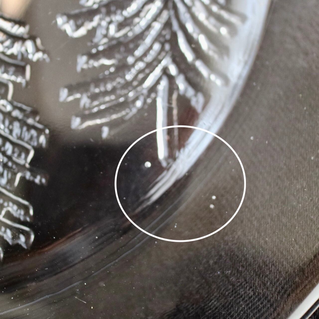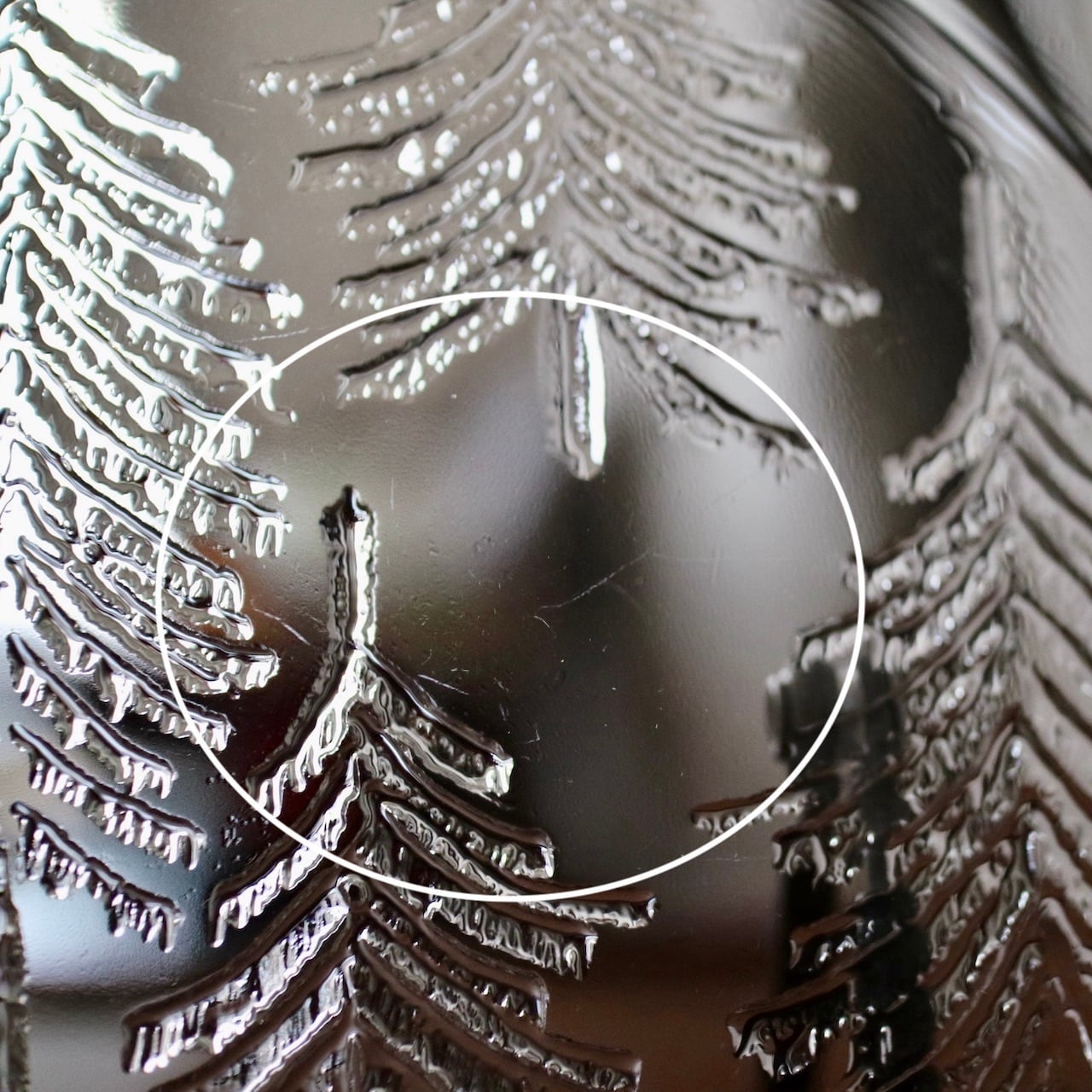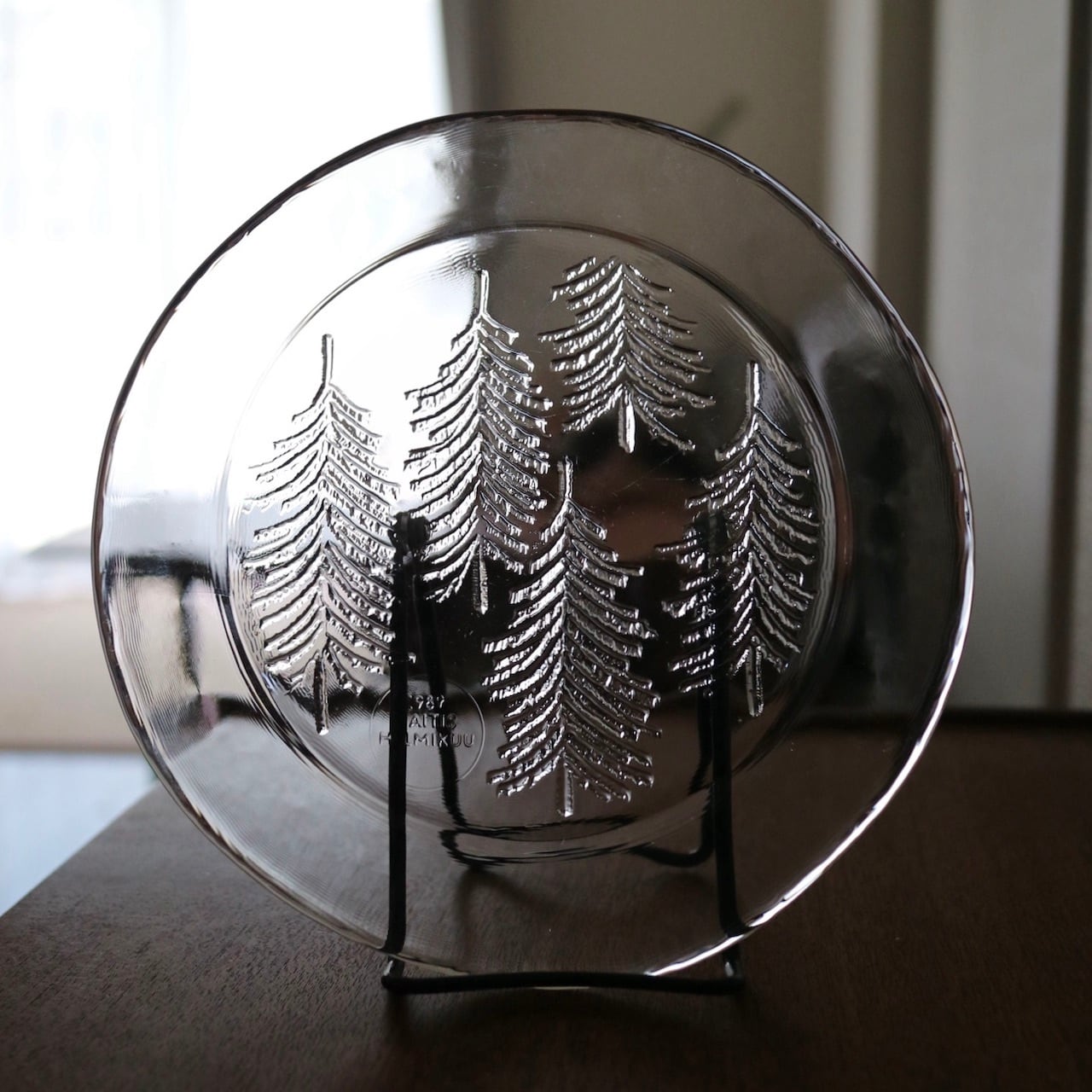 ほぼフラットなプレートにフィンランドらしいもみの木(厳密にはkuusi=トウヒの木)が装飾されており、またプレートの縁も綺麗な曲線ではなく手作りのようなライン。氷の中に閉じ込めたもみの木のような雰囲気でとても素敵な1枚です。