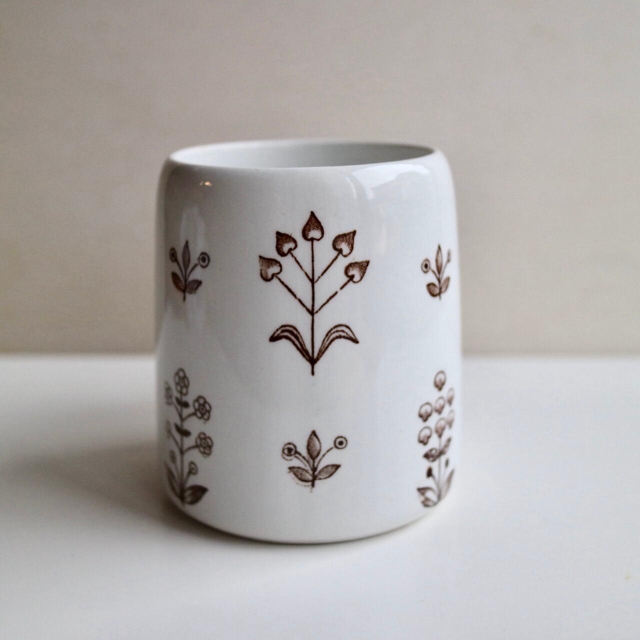 様々な花が等間隔で描かれ、クラシックな雰囲気が素敵なTapestry。こちらのカラーはホワイトの素地にブラウンの模様が入っています。こちらのビアマグは、Kurt Ekholm(クルト・エクホルム)デザインのフォルムに、現在も愛され続けている名作Paratiisi(パラティッシ)柄を生み出したBirger Kaipiainen(ビルガー・カイピアイネン)によってデコレーションされており、ビールを入れても安心して飲めるように持ち手も大きめです。Tapestryの中でもこのタイプは珍しい方かと思います。