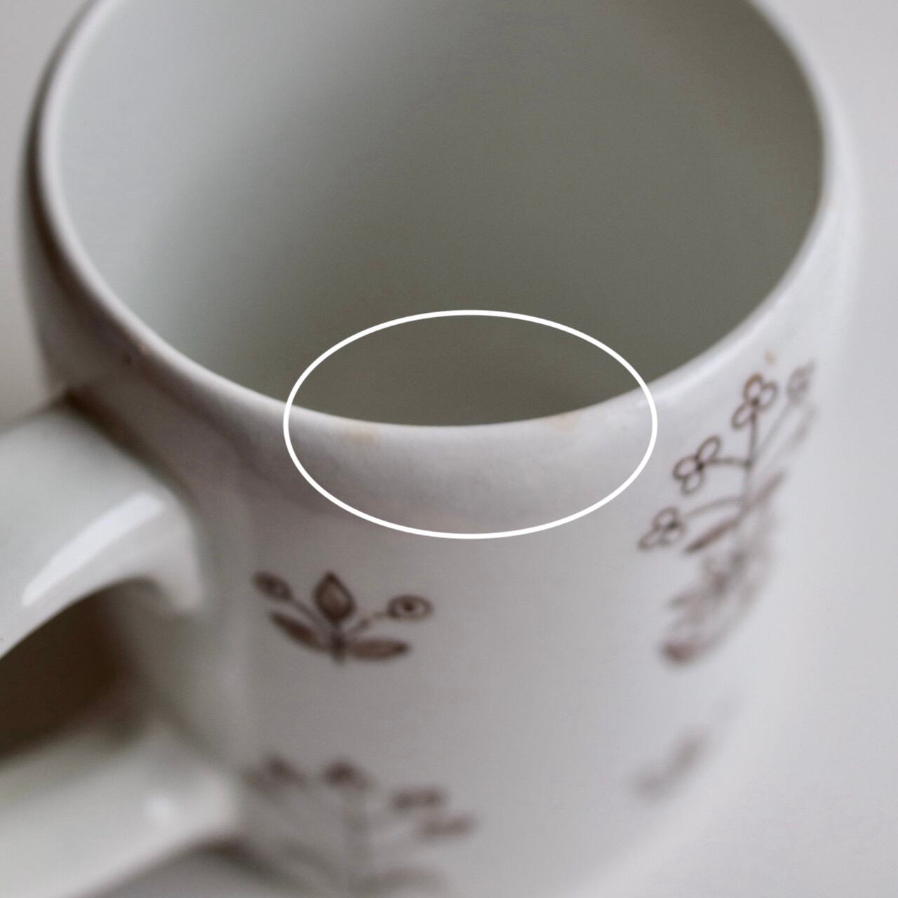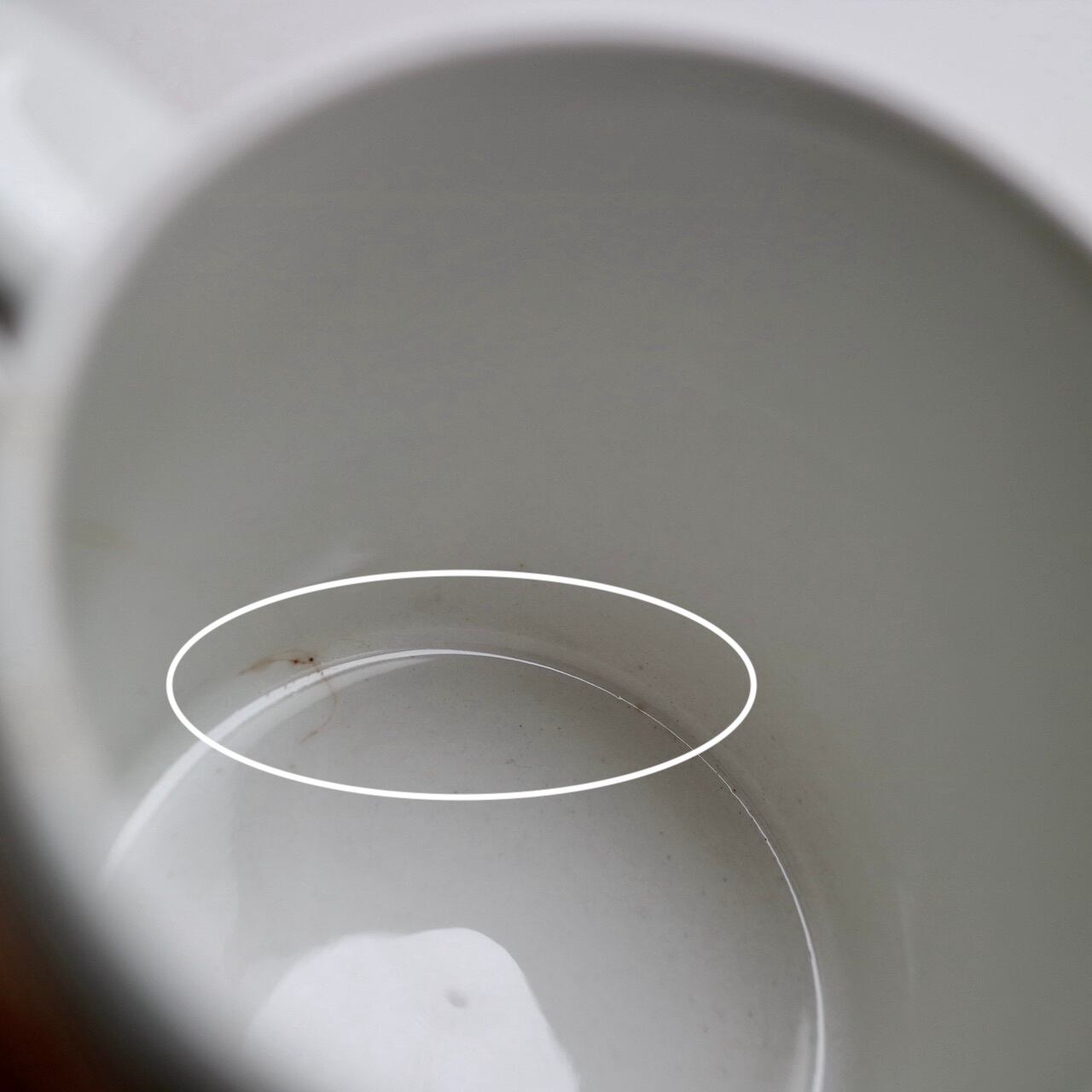 実際に使われていたお品ですので多少キズやシミが見られます。製造時からのものとして、全体的に柄のズレや抜け、濃淡、掠れなどが見られます。残念ながら、縁に欠けがあります。また、内底の貫入に着色も見られます。以上を考慮し、今回はOUTLET品といたしました。コンディションをご確認の上ご注文ください。