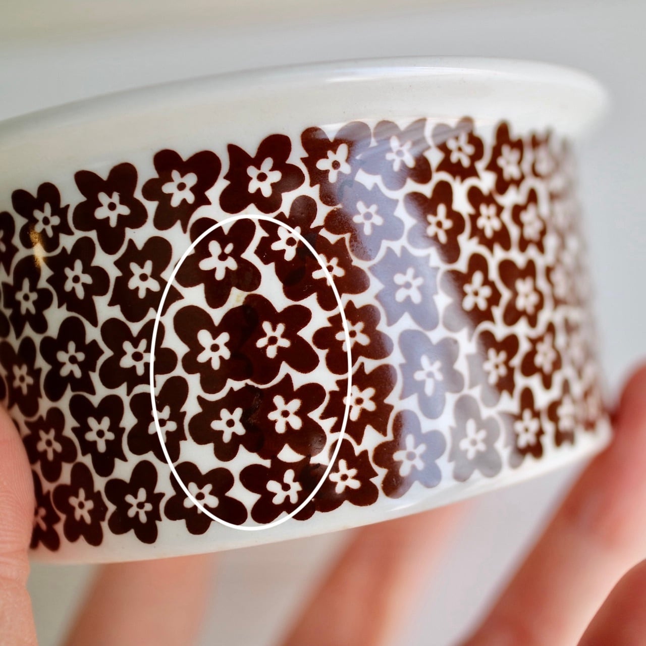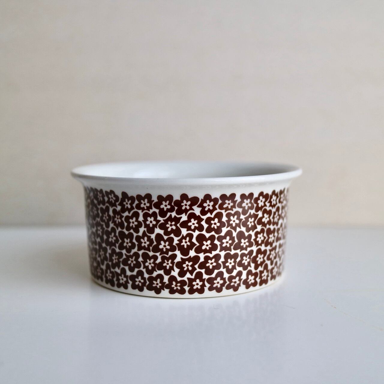 フォルムはPeter WinquistデザインのEHモデルで、イタリアのファエンツァで行われた国際陶芸コンペティションで受賞したことから、このシリーズにファエンツァの名がつけられました。Peterはラインのみで描かれたシリーズ(黄色と黒あり)をデザインしましたが、こちらの小花柄はInkeri Leivoによって装飾されています。