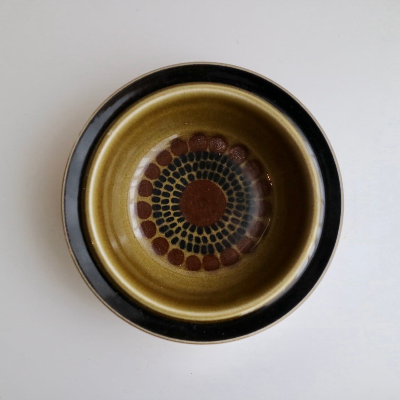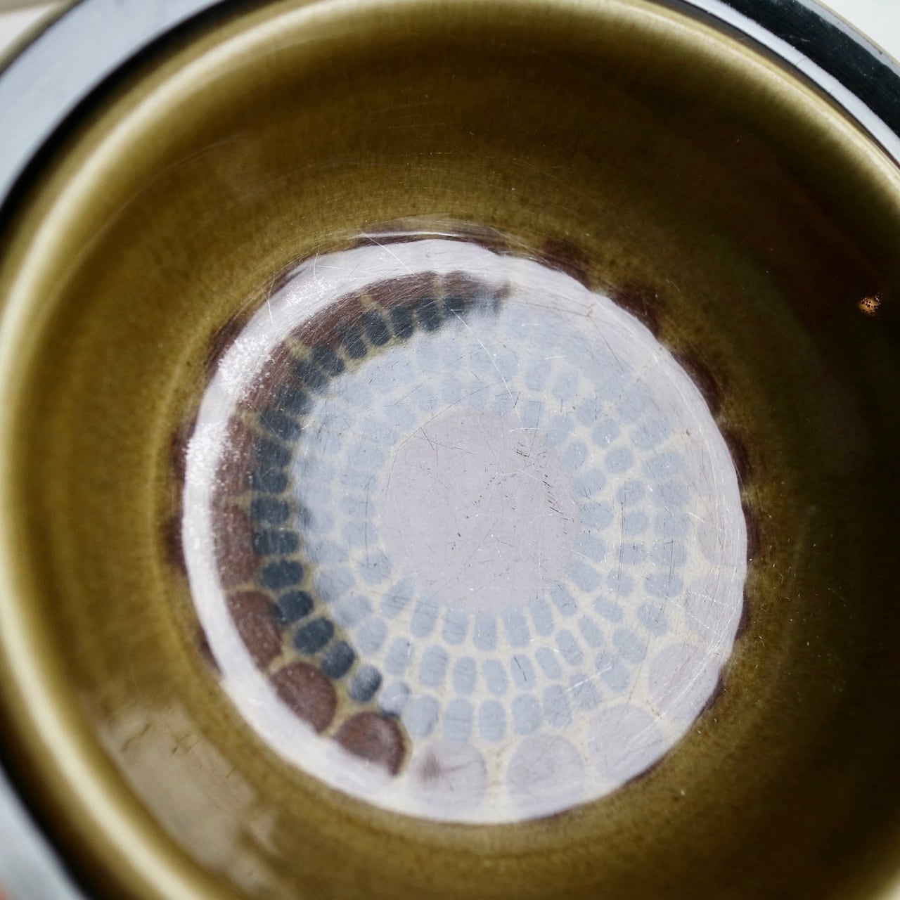 カーキ色の地に茶色や黒で彩られたKosmos。Ulla Procope(ウラ・プロコッペ)デザインのフォルムにGunvor Olin-Gronqvist(グンヴァル・オリン・グラングヴィスト)によってデコレートされたKosmosは、渋みのある色味と印象的な模様で人気のあるシリーズの一つです。