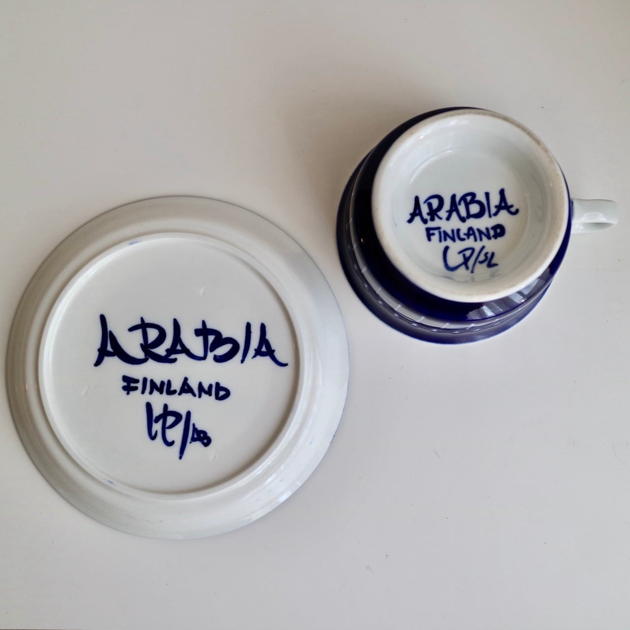 Valenciaは、丸や点、ライン、花などが深い藍色で手描きされており、フォルムもとても優雅。それらの美しさからファンがとても多いシリーズです。ハンドペイントのため、色の濃淡、線の強弱なども異なります。裏面にはUP(デザイナーのUlla Procopeのイニシャル)と絵付け師のイニシャルが書かれています。