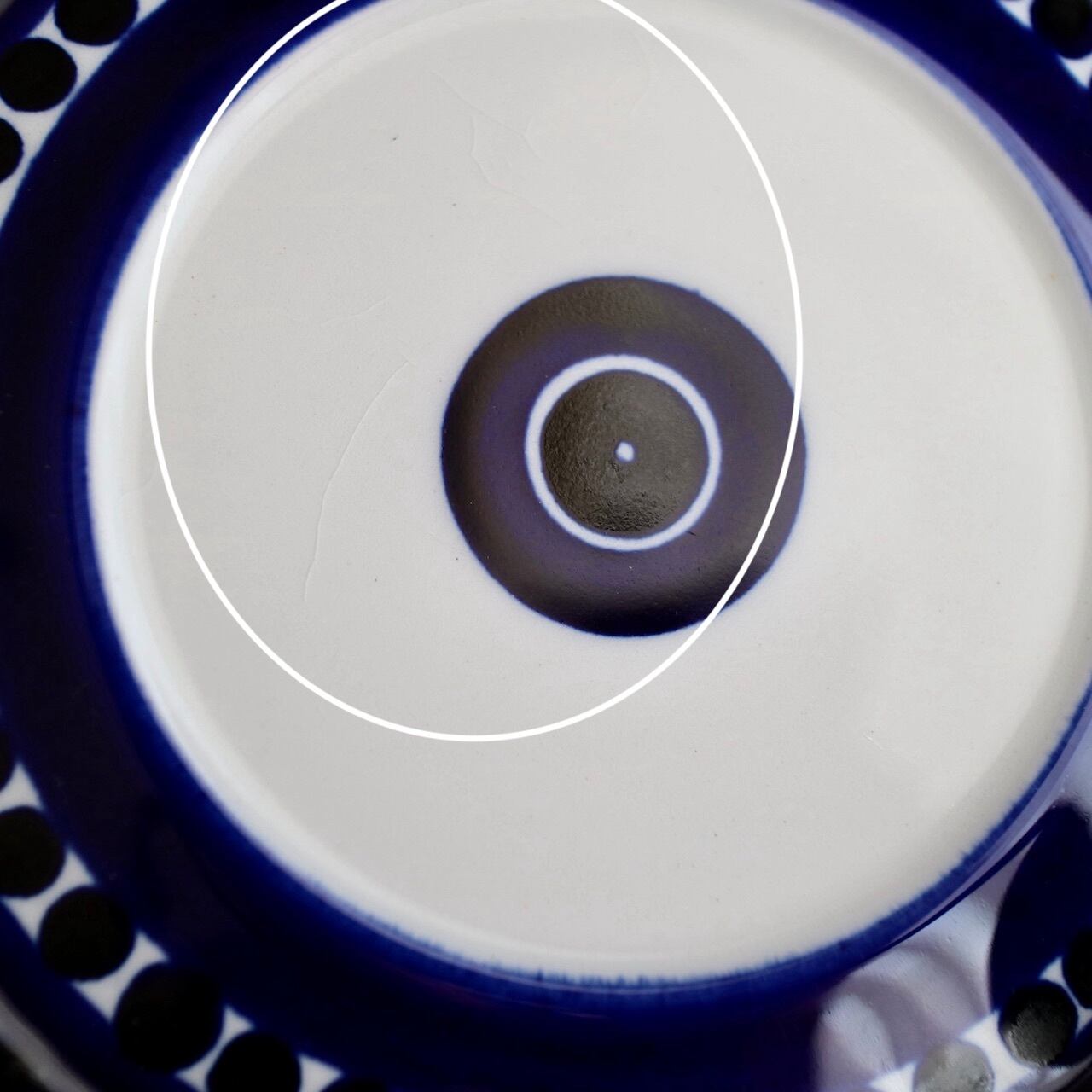Valenciaは、丸や点、ライン、花などが深い藍色で手描きされており、フォルムもとても優雅。それらの美しさからファンがとても多いシリーズです。ハンドペイントのため、色の濃淡、線の強弱なども異なります。裏面にはUP(デザイナーのUlla Procopeのイニシャル)と絵付け師のイニシャルが書かれています。