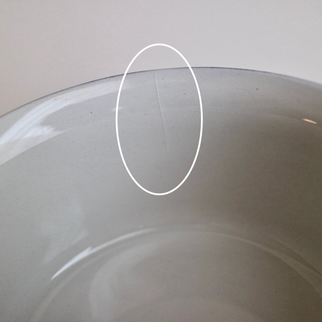 実際に使われていたお品ですので多少汚れやキズが見られます。製造時からのものとして、色飛びや形成不良(カップの縁に微細な凹み→これは見た目だけで釉薬がかかっているので触ってもあまり気になりません)などが見られます。また、残念ながら、ソーサーの上面に少しの貫入、カップの縁にヒビが見られます。以上を考慮し、今回はOUTLET品といたしました。コンディションをご確認の上ご注文ください。なお、ソーサーの裏に数カ所丸や線の跡のようなものが見られますが、こちらは重ねて焼く際に支柱を置いたことでできる跡です。