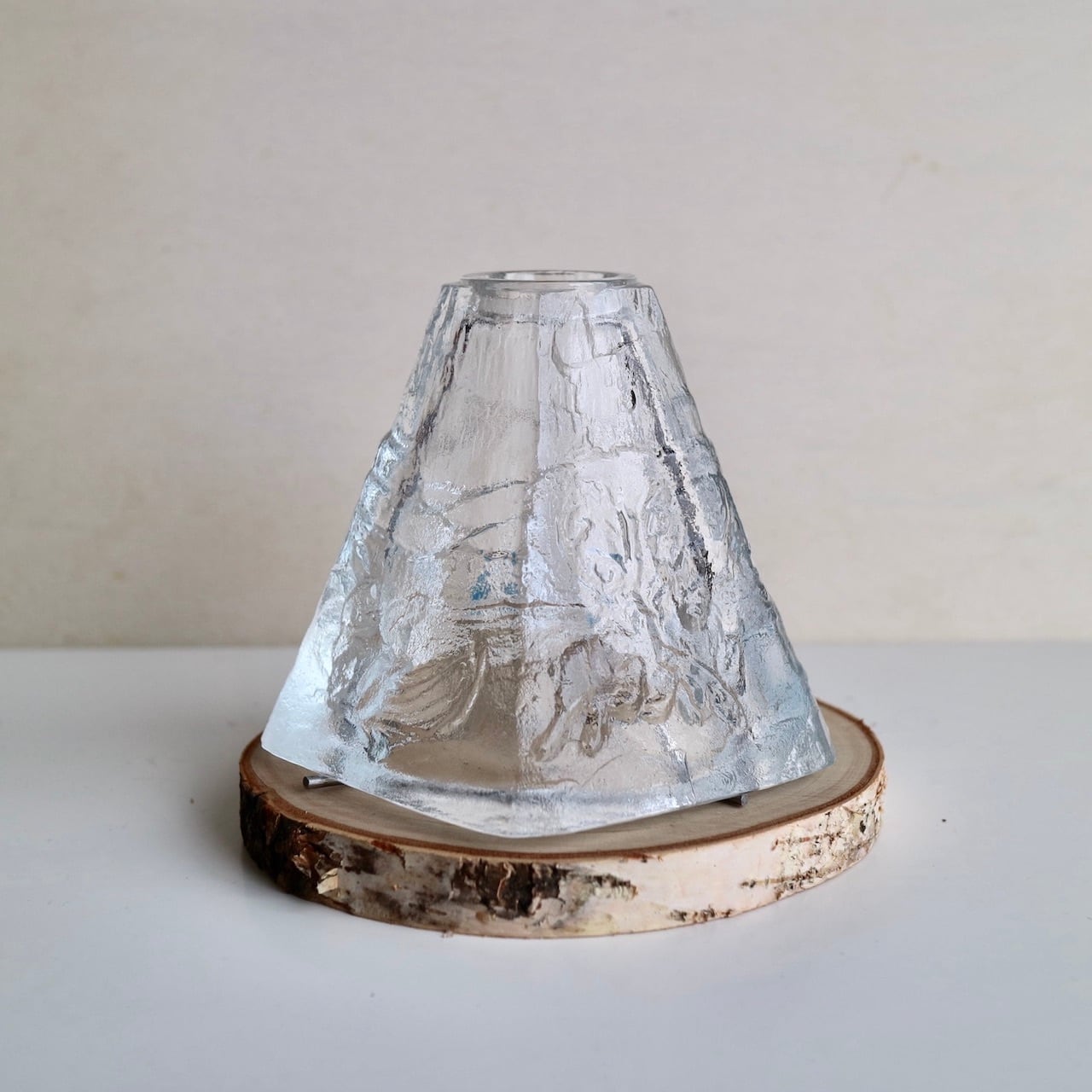 白樺のベースに金具をセットし、ティーライトキャンドルとラップランドの小屋をイメージしたガラス部分を乗せてランタンのようにお楽しみいただけるキャンドルホルダーです。ガラス部分は上部から見ると五角形で、トナカイなども描かれています。