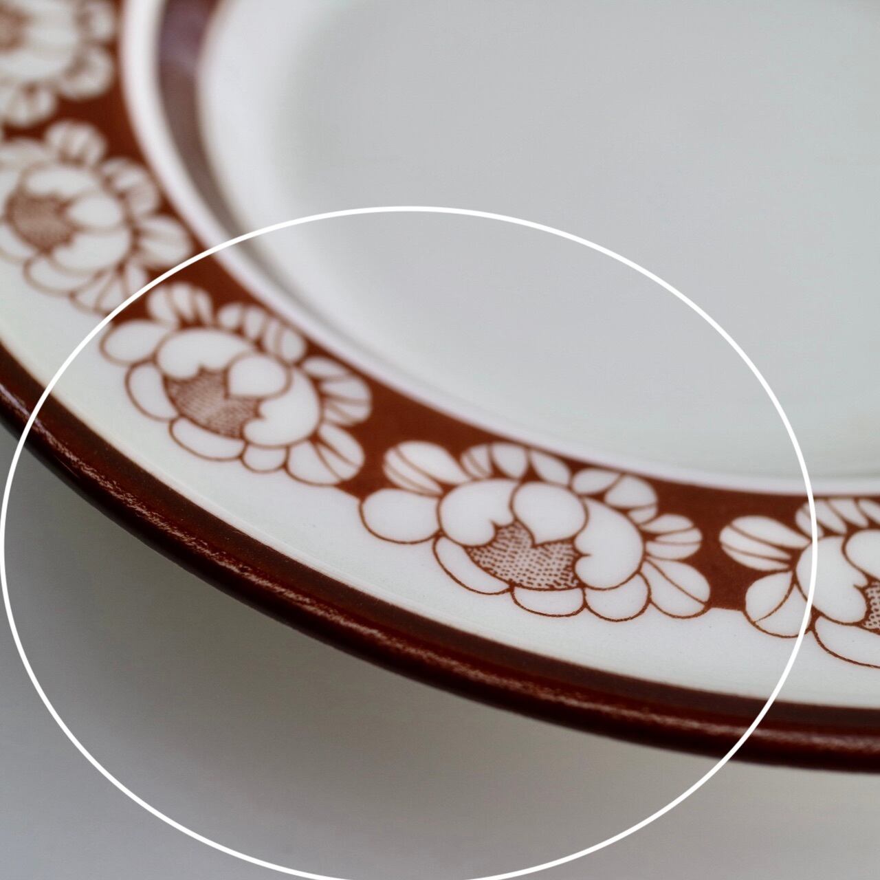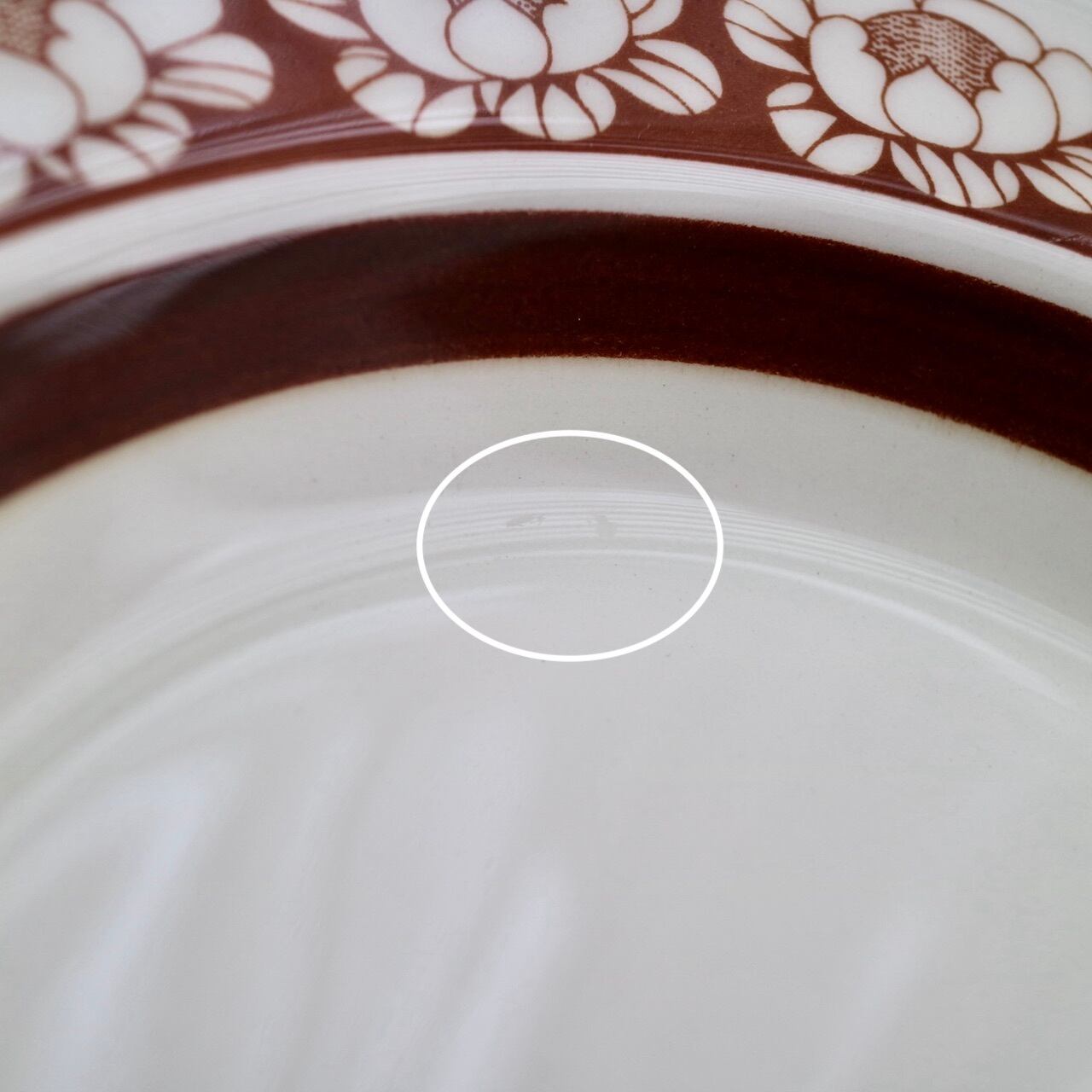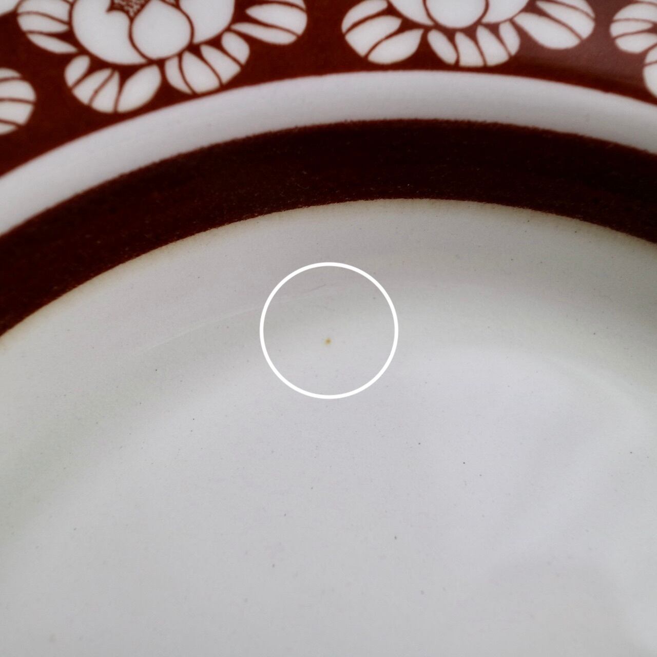 実際に使われていたお品ですので、多少キズなど見られますが、ヒビやチップはありません。艶もあり、全体的にかなり綺麗な方かと思いますので、ヴィンテージ品としてはとても良好な状態です。製造時からのものとして、茶点や滲み、掠れなどが見られます。なお、裏には数カ所丸い跡のようなものが見られますが、こちらは重ねて焼く際に支柱を置いたことでできる跡です。