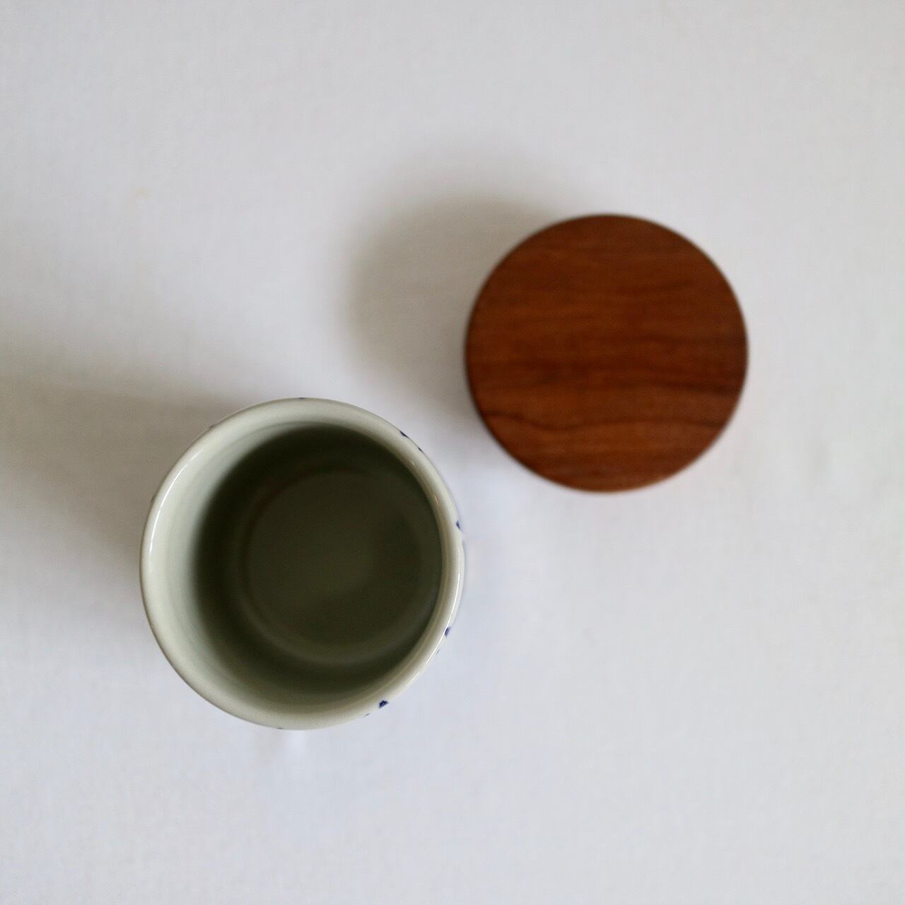 Marianne Westman(マリアンヌ・ウェストマン)デザインで、藍色のハンドペイントの模様と筆記体の文字が描かれています。こちらはRosmarin:ローズマリーのジャーです。そのまま置いておくだけでもインテリアとして素敵だと思います。
