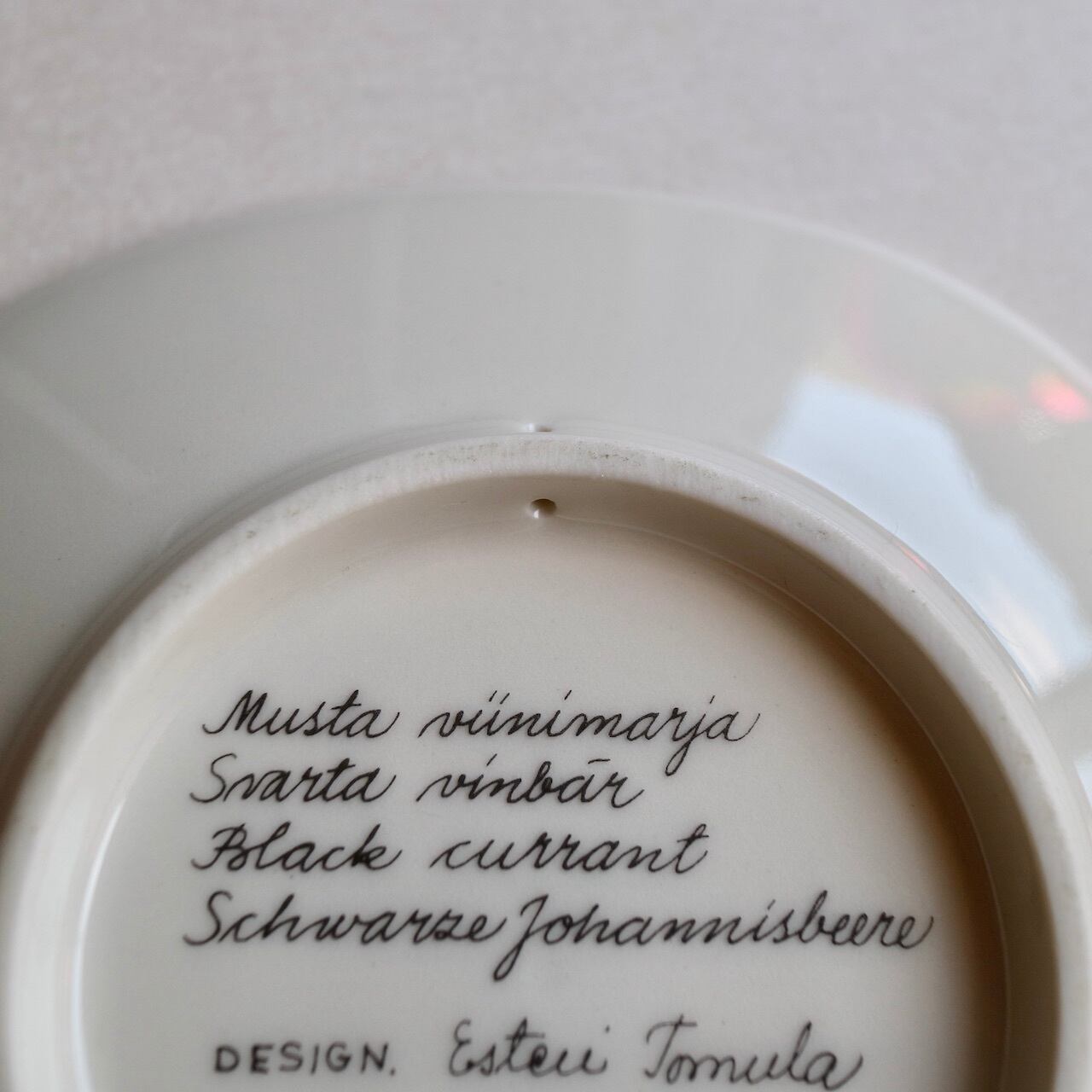 フィンランドの野生の花や果実などを描いたEsteri Tomula(エステリ・トムラ)デザインのBotanicaシリーズは1978年にスタートし1989年まで製作されました。そのうち、こちらは1982年から1986年の間に製作された森のベリーシリーズの一つです。青いカシスの実に繊細なタッチの葉や花も描かれています。