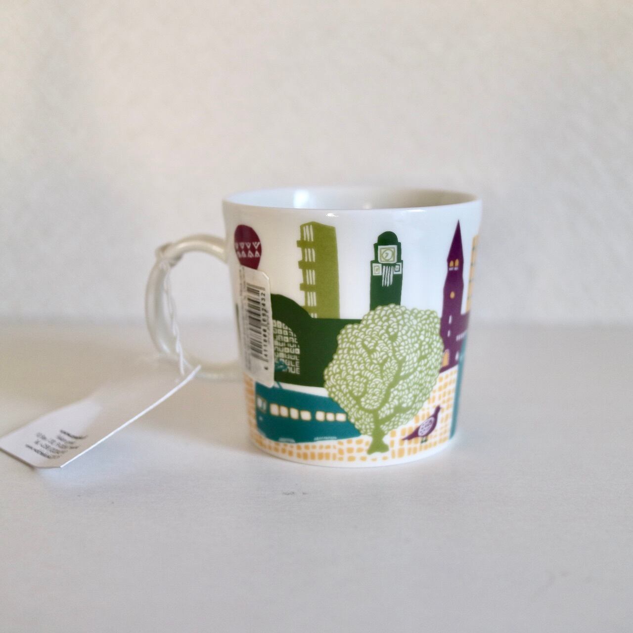 2012年、World Design Capitalにヘルシンキが選ばれたことを記念して発売された限定のHometownシリーズのマグカップで、白地のTeema(ティーマ)の300mlマグをベースに、ダウンタウン、海、公園、街の4種類の絵柄が作られました。こちらはダウンタウン柄で、ヘルシンキの中心部の街並みがグリーン系の色味で描かれています。