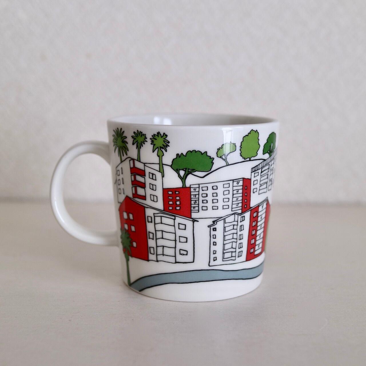 こちらのマグは、Teema(ティーマ)の白の300mlマグをベースに、木や赤い壁面のアパートなどが建ち並ぶ中、そこを通る道やトラックが描かれています。フィンランドの旗も端にちょこっと描かれています。