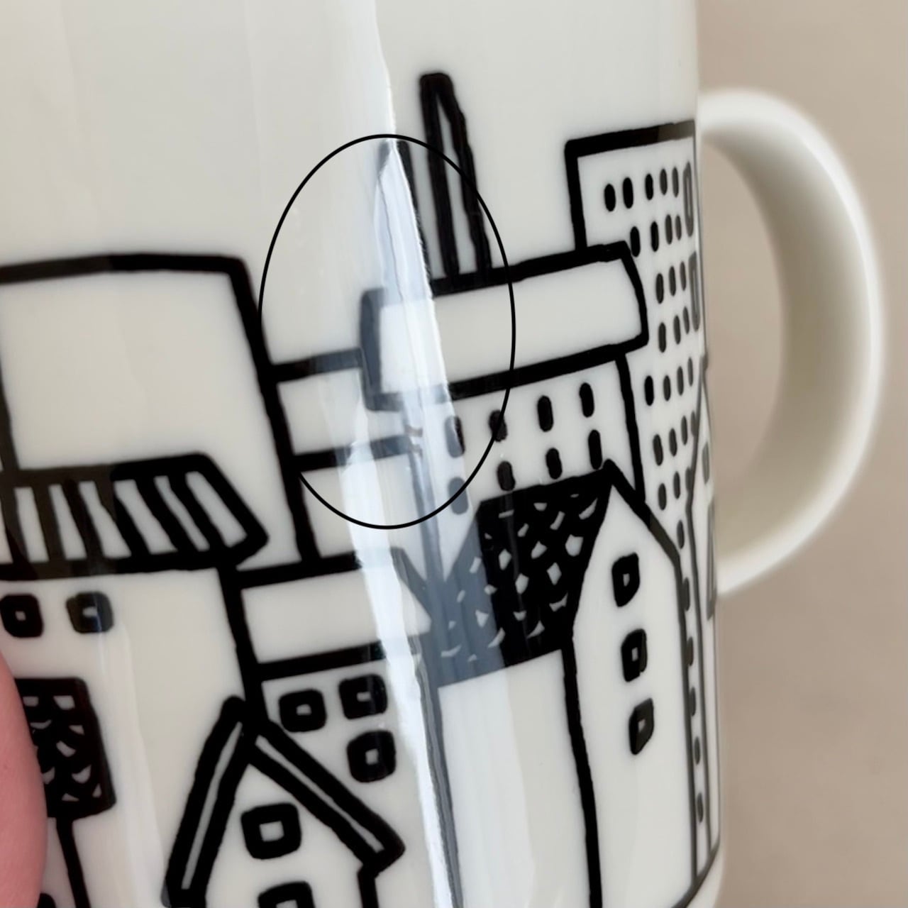 Teema(ティーマ)の300mlマグをベースに、たくさんの家やビルが黒で描かれています。白と黒のみのシンプルなマグですが、お家の形、屋根の形もさまざま。それを見るのも楽しいですし、サインペンで書いたようなイラストもなんだかほっこりするようでとても素敵なマグです。